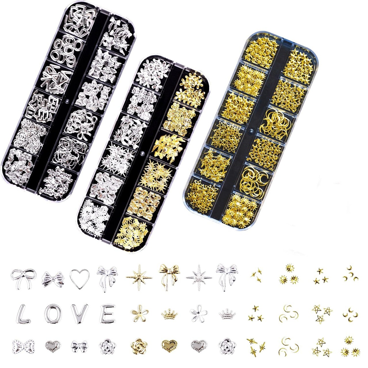 【パッケージ内容】このパッケージには、シルバーとゴールドの異なるスタイルのネイルアート用デコレーションパーツが3箱入っている。装飾パーツは、さまざまなサイズや柄のデザイン、さまざまなスタイルから選ぶことができ、ナチュラルネイルにも人工爪にも使用できる。