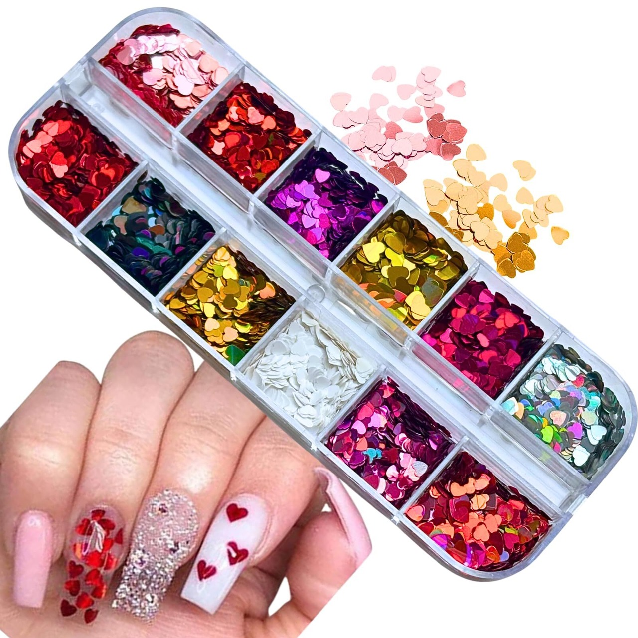 小さな可愛いハート型のホログラムが12色入りとなっております。10色については、2㎜のスモールサイズのハートフレークが各色ともにはいっています。残りの2色、ゴールドとピンクは3㎜の中サイズが入っております。ホログラムなので、光の角度によって色が変わります。ネイルアートに使用する場合は、ジェルネイルやデコネイルで、爪にキラキラした輝きを加えます。また、クラフトアクセサリーとして、レジン封入やガラスドームの装飾にもご利用いただけます。