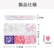 【製品仕様】サイズ:ケース長7.3 cm*幅4.7 cm*高さ1.1 cm、スパンコールのサイズは3mm*2mmです。総重量は約18g。6色の桜ネイルアートグリッターが入っています。