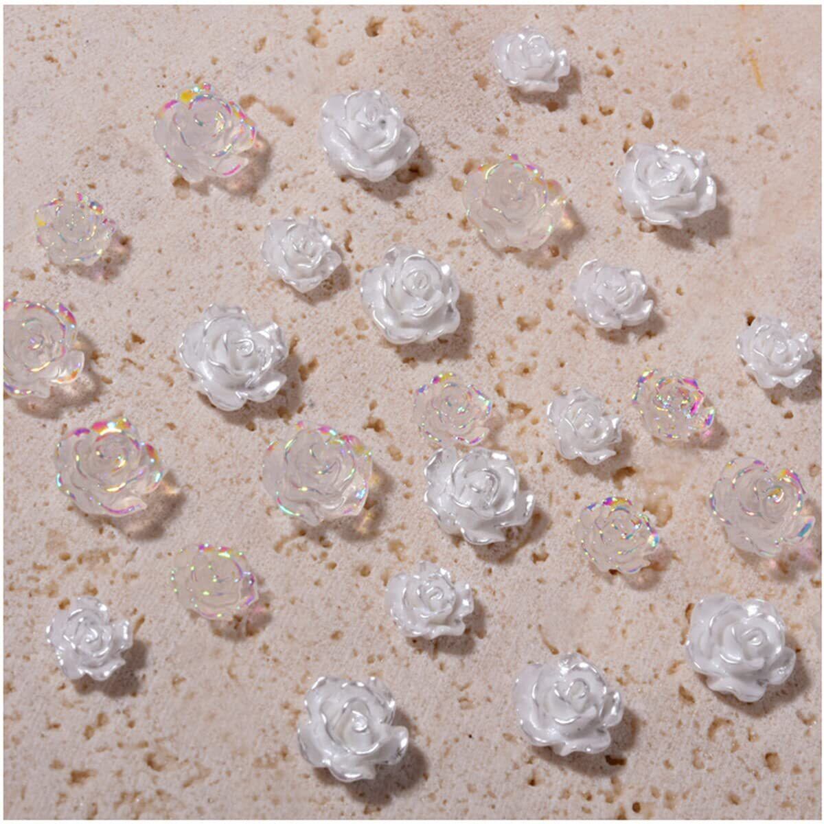 2種色3D椿型パーツ、色:白,オーロラカラー。サイズ約6.5mm、8mm。毎種15個,合計60個