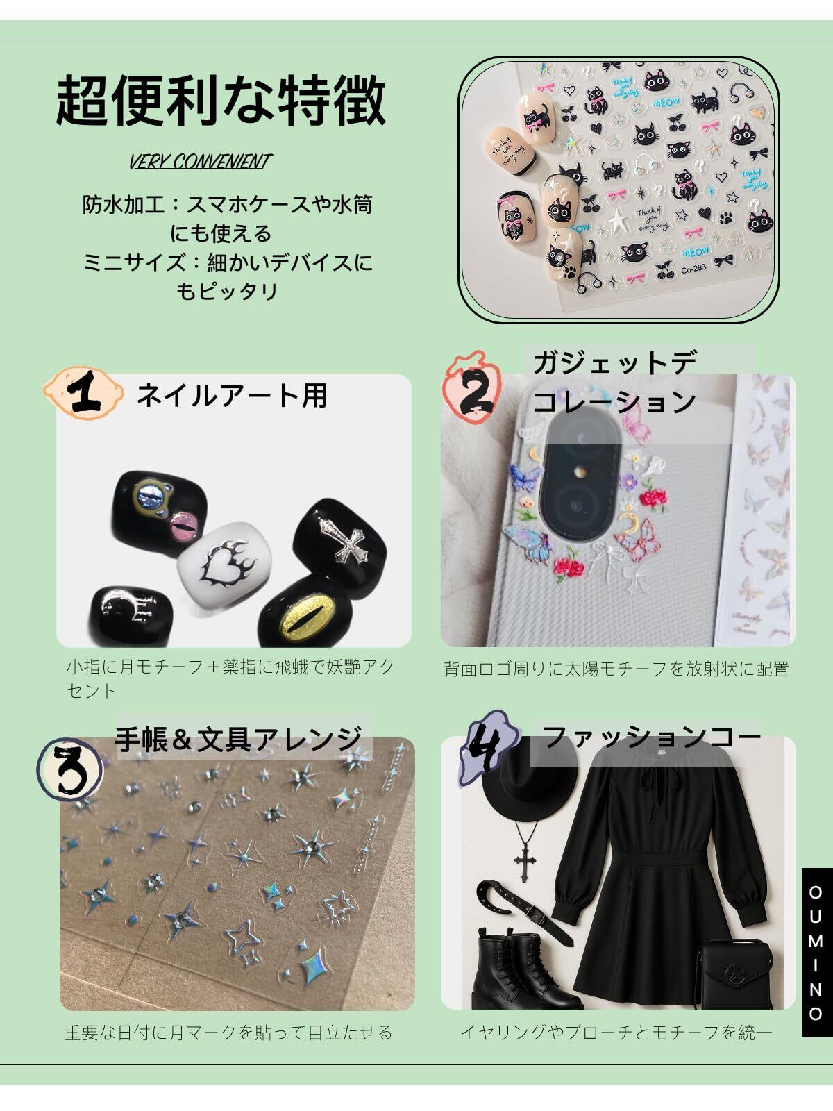 Oumino ネイルシール 3D 猫ネイルステッカー 2枚+10デザイン かわいい・ゴシック・クール猫 立体デコ スマホケース/AirPods装飾可能 はがせる おしゃれ セルフネイル 簡単