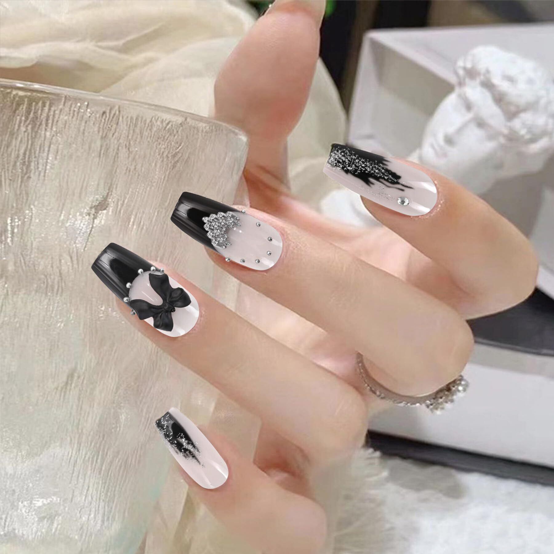【新春セール】ネイルチップ ロング 24枚入 黒 人気 3D 和風 付け爪 おしゃれ 可愛い 弓 つけ爪 成人式 入学式 卒業式 結婚式 パーティー 花嫁ネイル ネイル チップ 両面テープ ウッドスティック ネイルファイル付き(D347) | Lumisfera