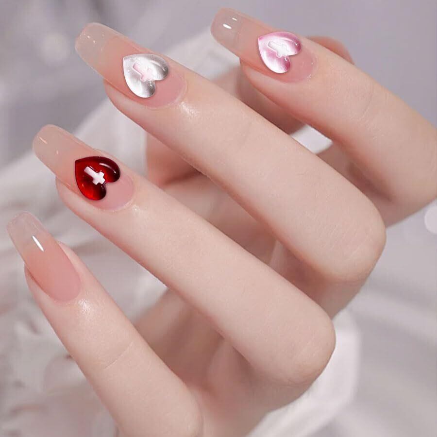 【ネイルパーツ】透け感のあるハートネイルパーツが登場!十字架の装飾が施されたハート型パーツは、ユニークなデザインで、ネイルアートに魅力を加え、女性らしさをより個性的に演出します。