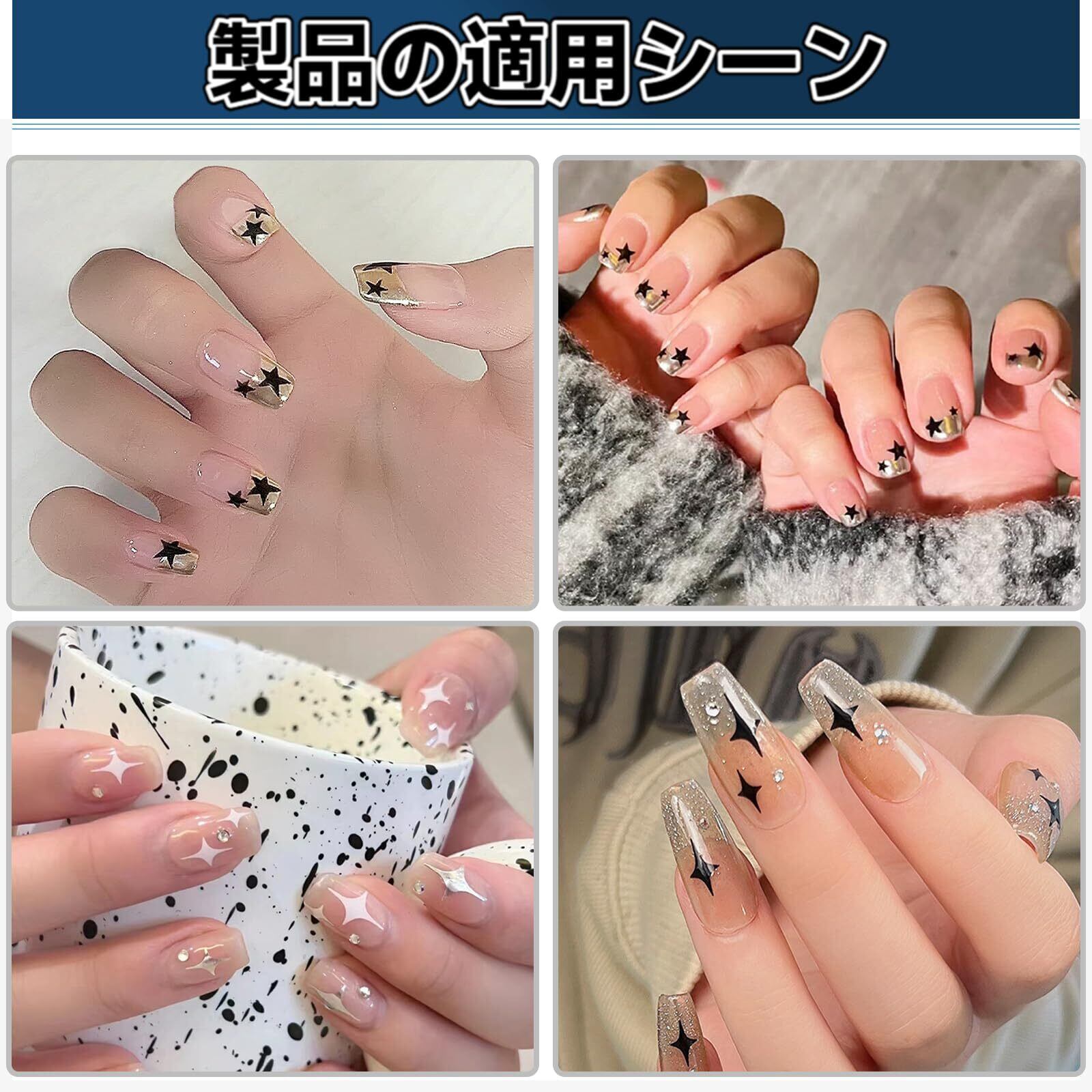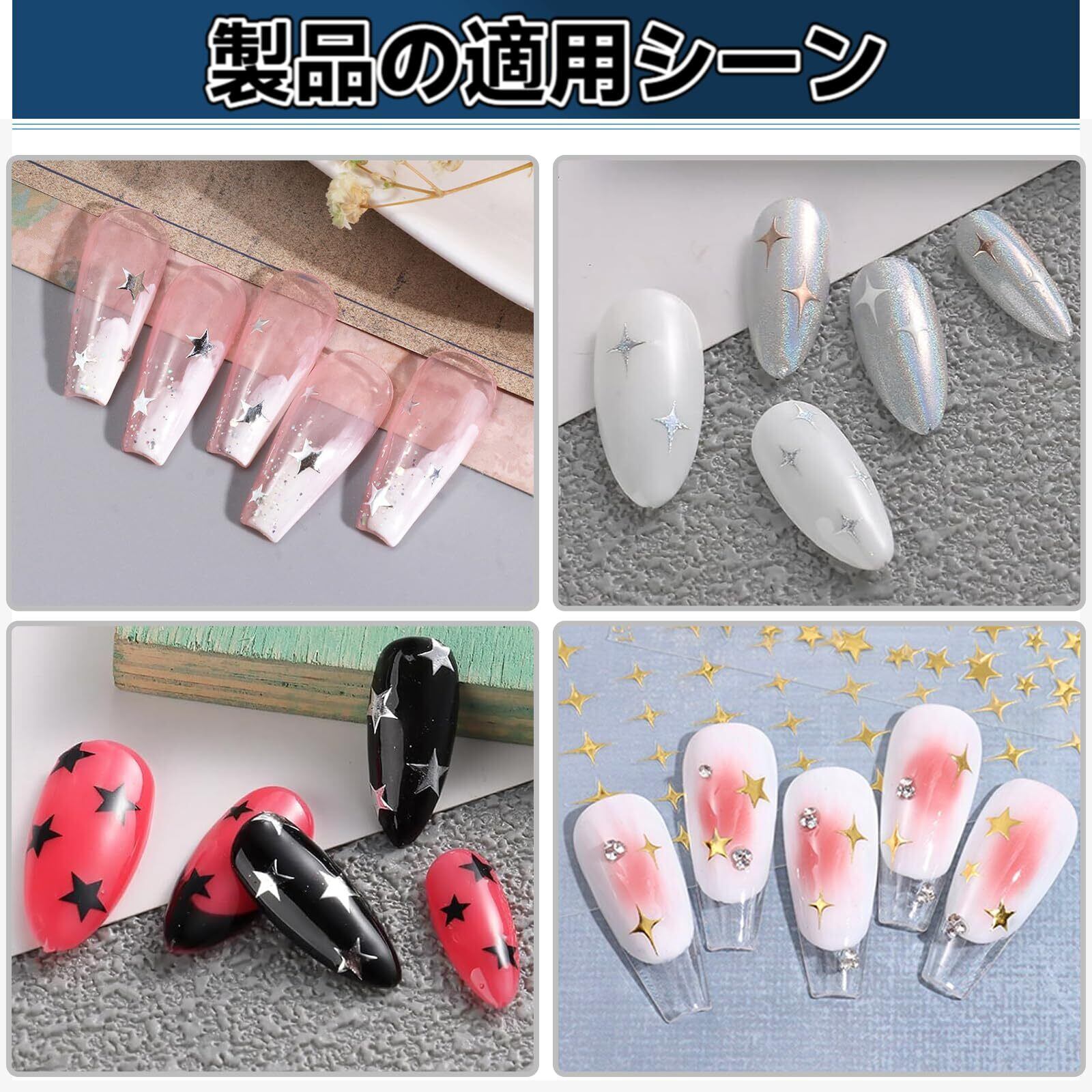 【多彩なネイルシール】星のかけら、五角星が揃った、黒、白、金、銀、ローズゴールド、カラフルのカラフルな11枚セット。異なる角度から美しい輝きを放ち、エレガントな視覚効果を演出します。