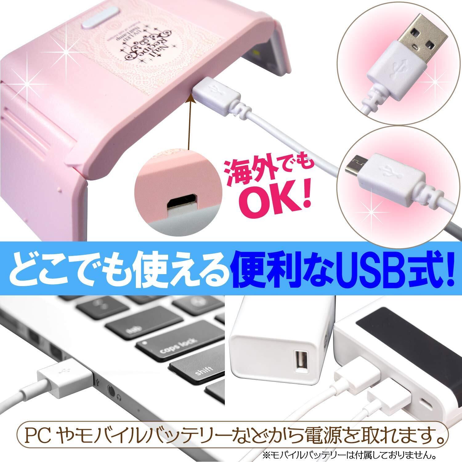 USBケーブルを電源に接続してください。手や足をLEDライトの下に位置させて、爪が直接ライトの下に来るようにしてください。デバイスをオンにしてください。通常のネイルポリッシュの場合、推定30-60秒間爪をライトの下に置いてください。乾燥時間が過ぎたらデバイスをオフにしてください。
