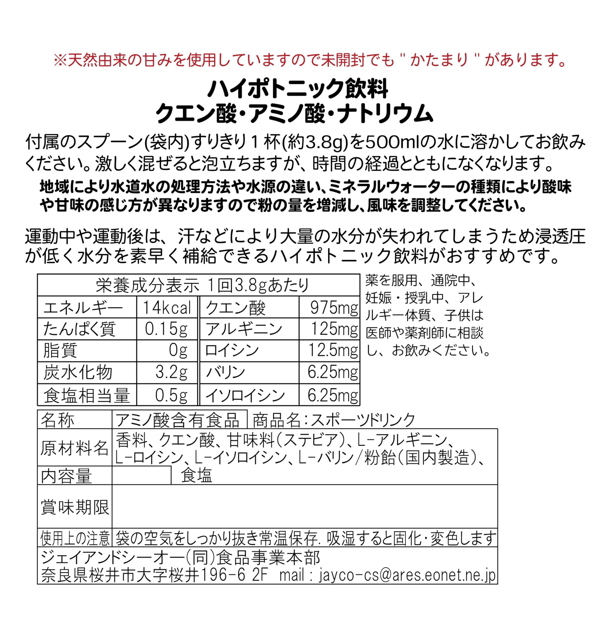 クエン酸.香料.甘味料(ステビア).アルギニン.ロイシン.バリン.イソロイシン/ 粉飴(国内製造).食塩