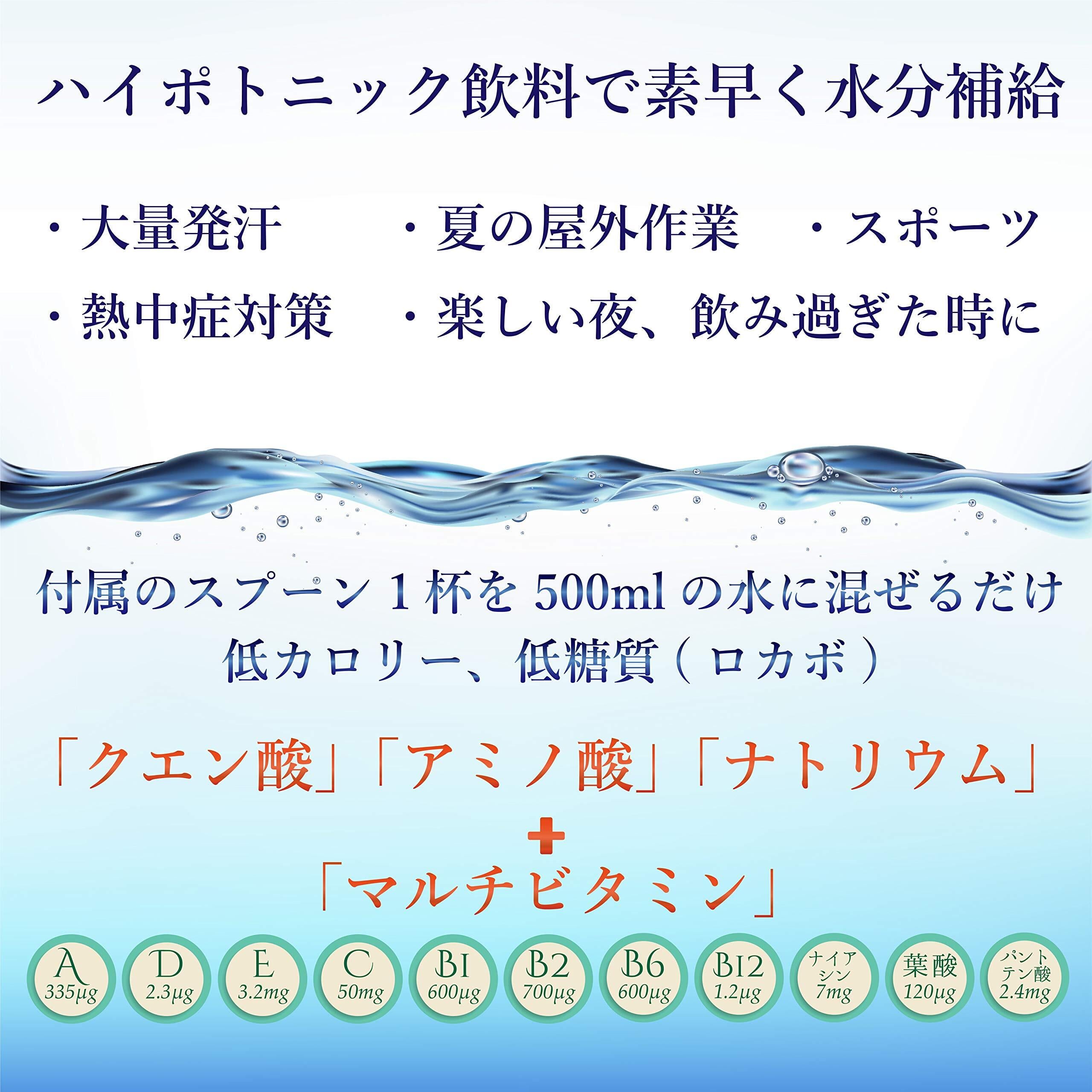 付属のスプーン1杯を500mlの水に混ぜるだけ。「水分」「マルチビタミン」「クエン酸」「アミノ酸」「ナトリウム」を素早くチャージ。
