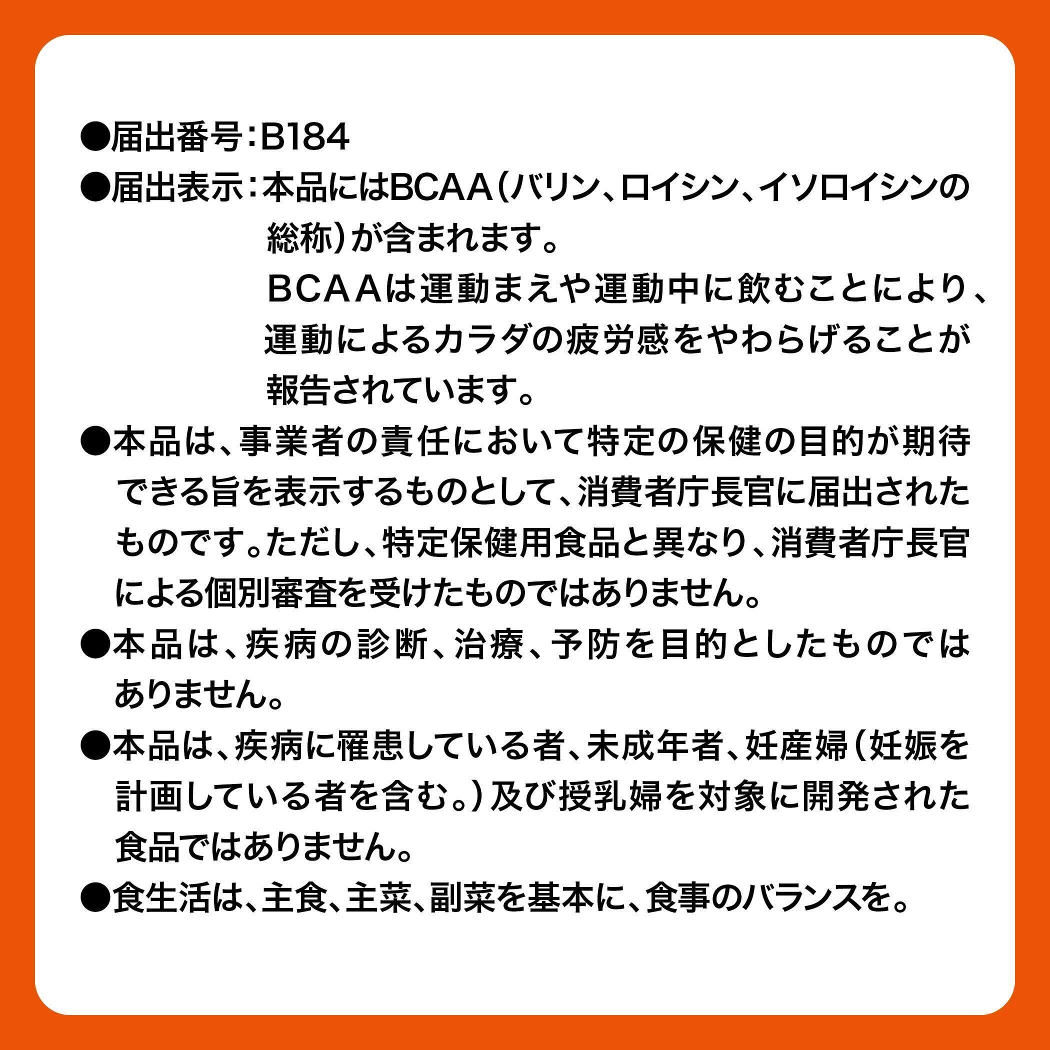 本品にはBCAA(バリン、ロイシン、イソロイシンの総称)が含まれます。BCAAは運動まえや運動中に飲むことにより、運動によるカラダの疲労感をやわらげることが報告されています。