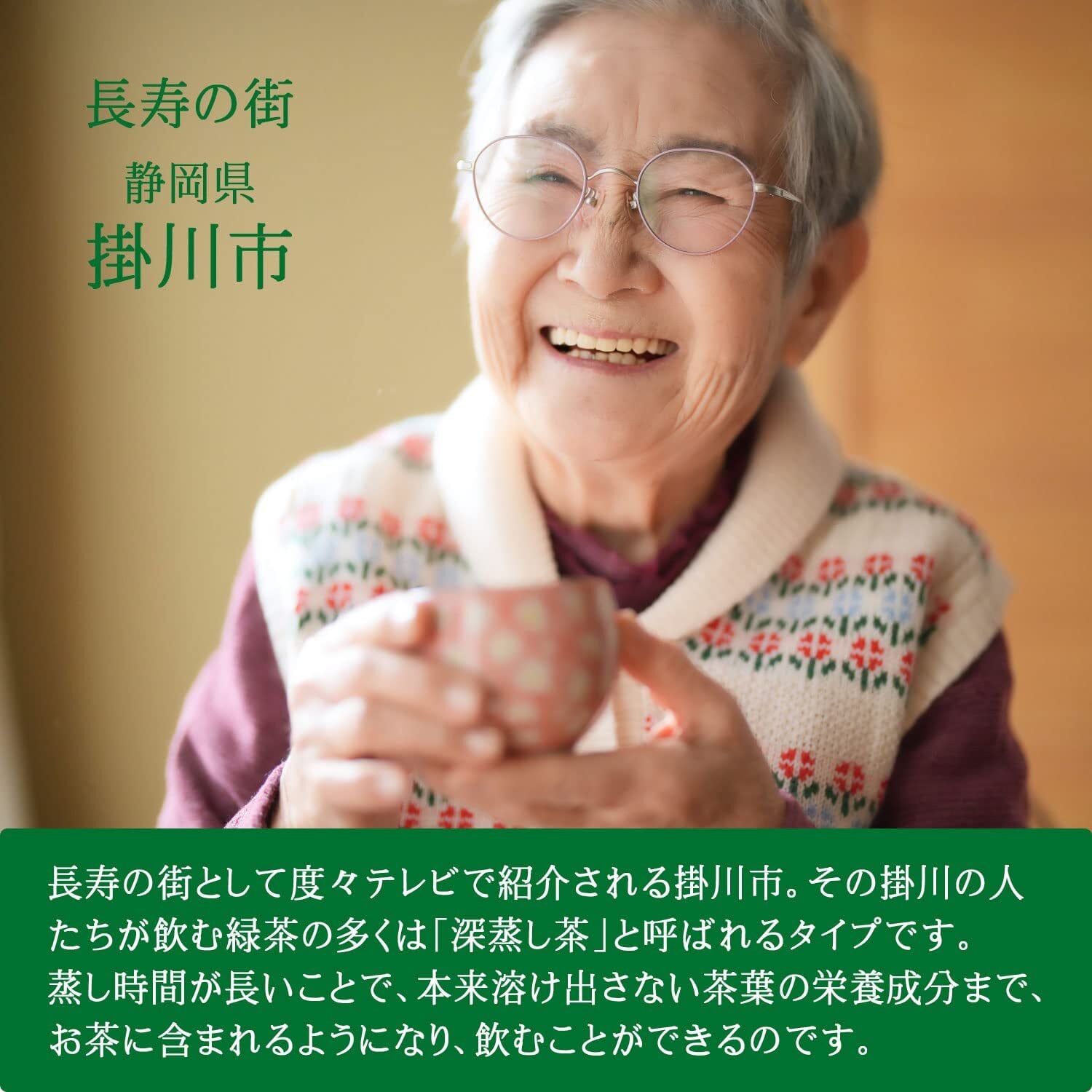 長寿の街として度々テレビで紹介される掛川市。その掛川の人たちが飲む緑茶の多くは「深蒸し茶」です。蒸し時間が長いことで、本来溶け出さない茶葉の栄養成分までお茶に含まれるようになります。