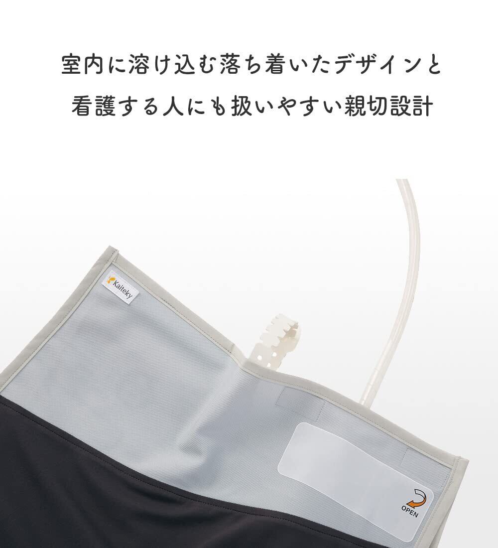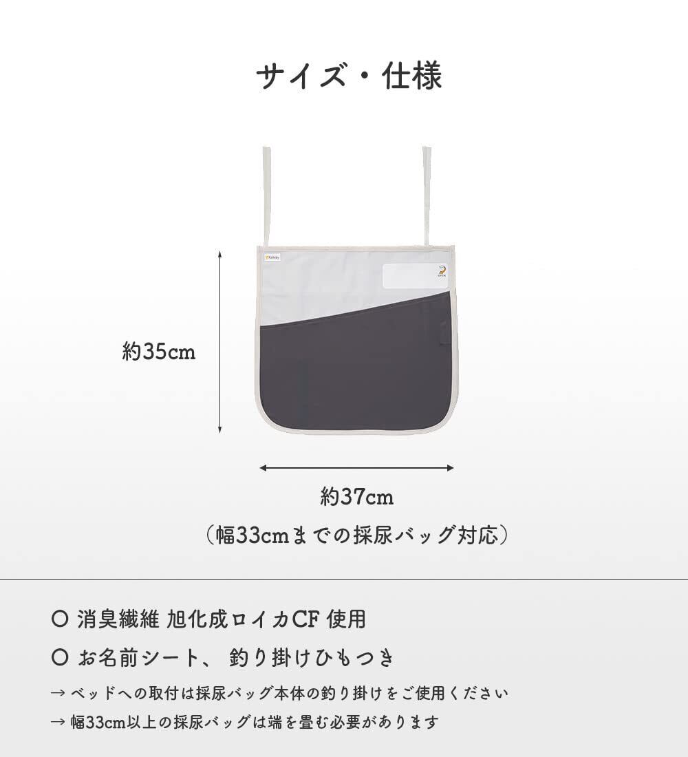採尿バッグ(導尿バッグ、ウロバッグ)のための室内用消臭カバー。気になるニオイを緩和する「旭化成ロイカCF」を本体布地に採用しました。室内に溶け込むやさしいデザインや介助者にも扱いやすい設計となっています。介護施設ですぐ使える「名前欄」つき。