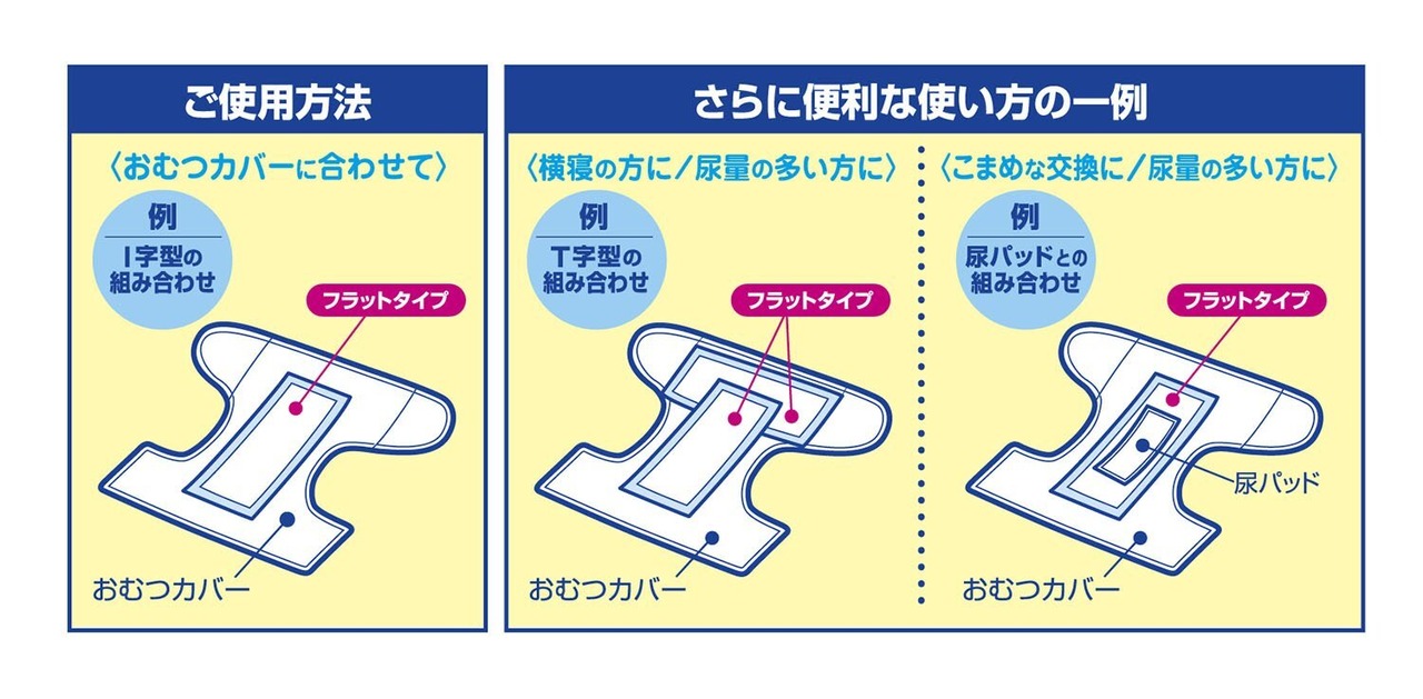 おむつカバーと併用してご使用いただく、フラットタイプの尿とりパッド。すばやく拡散してモレずに安心。