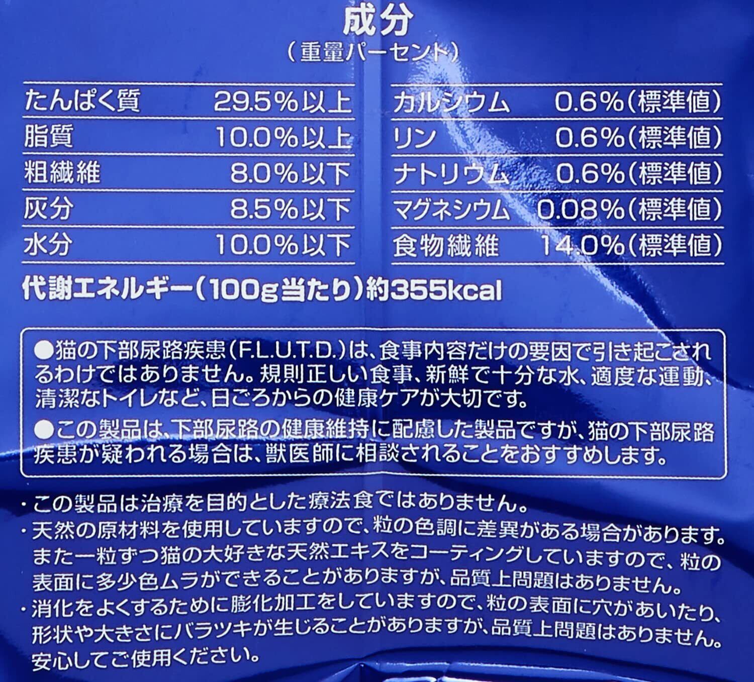 たんぱく質29.5%以上、脂質10%以上、粗繊維8%以下、灰分8.5%以下、水分10%以下