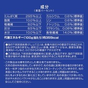 穀類(とうもろこし、コーングルテンミール)、肉類(ミートミール、チキンミール、チキンレバーパウダー)、豆類(おから、脱脂大豆)、油脂類(動物性油脂)、セルロース、魚介類(フィッシュミール、フィッシュエキス)、糖類(フラクトオリゴ糖)、卵類(ヨード卵粉末)、シャンピニオンエキス、セレン酵母、ビタミン類(A、D3、E、K3、B1、B2、パントテン酸、ナイアシン、B6、葉酸、ビオチン、B12、コリン、イノシトール)、ミネラル類(カルシウム、リン、ナトリウム、カリウム、塩素、鉄、コバルト、銅、マンガン、亜鉛、ヨウ素)、アミノ酸類(メチオニン、トリプトファン、タウリン)、酸化防止剤(ローズマリー抽出物、ミックストコフェロール)