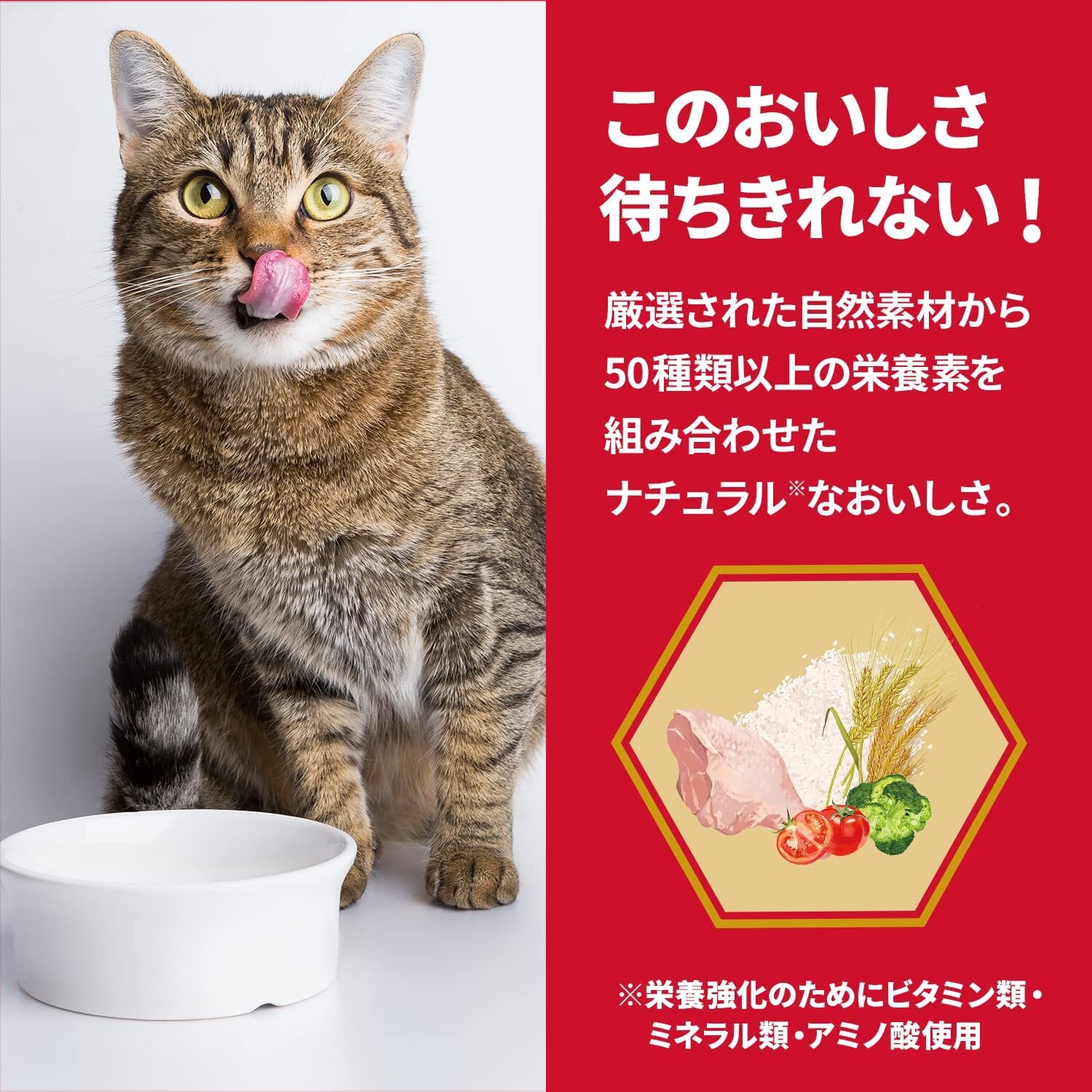 米、コーングルテン、チキン、小麦グルテン、セルロース、トマト、ビートパルプ、亜麻仁、動物性油脂、チキンエキス、ココナッツ油、ニンジン、小麦、ミネラル類(カルシウム、リン、ナトリウム、カリウム、クロライド、銅、鉄、マンガン、セレン、亜鉛、イオウ、ヨウ素)、アミノ酸類(タウリン、メチオニン、リジン)、乳酸、ビタミン類(A、B1、B2、B6、B12、C、D3、E、ベータカロテン、ナイアシン、パントテン酸、葉酸、ビオチン、コリン)、酸化防止剤(ミックストコフェロール、ローズマリー抽出物、緑茶抽出物)、カルニチン