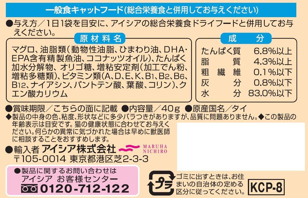 マグロ、油脂類(動物性油脂、ひまわり油、DHA-EPA含有精製魚油、ココナッツオイル)、たんぱく加水分解物、オリゴ糖、増粘安定剤(加工でん粉、増粘多糖類)、ビタミン類(A、D、E、K、B1、B2、B6、B12、ナイアシン、パントテン酸、葉酸、コリン)、クエン酸カリウム