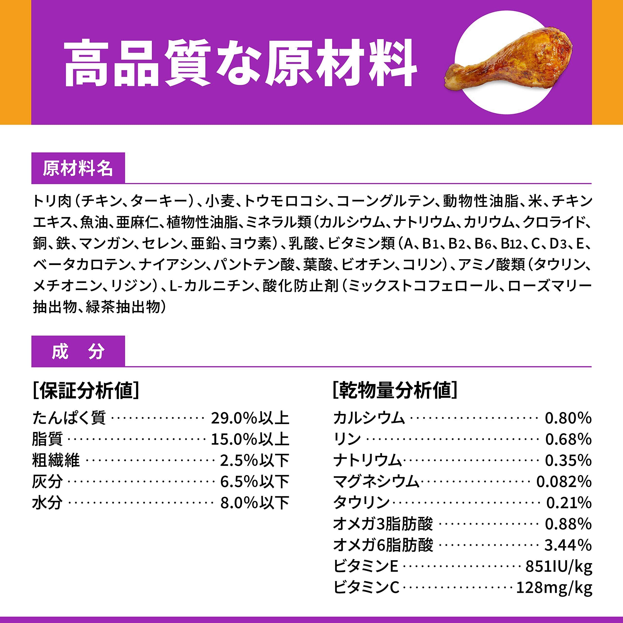 トリ肉(チキン、ターキー)、小麦、トウモロコシ、コーングルテン、動物性油脂、米、チキンエキス、魚油、亜麻仁、植物性油脂、ミネラル類(カルシウム、ナトリウム、カリウム、クロライド、銅、鉄、マンガン、セレン、亜鉛、ヨウ素)、乳酸、ビタミン類(A、B1、B2、B6、B12、C、D3、E、ベータカロテン、ナイアシン、パントテン酸、葉酸、ビオチン、コリン)、アミノ酸類(タウリン、メチオニン、リジン)、L-カルニチン、酸化防止剤(ミックストコフェロール、ローズマリー抽出物、緑茶抽出物)