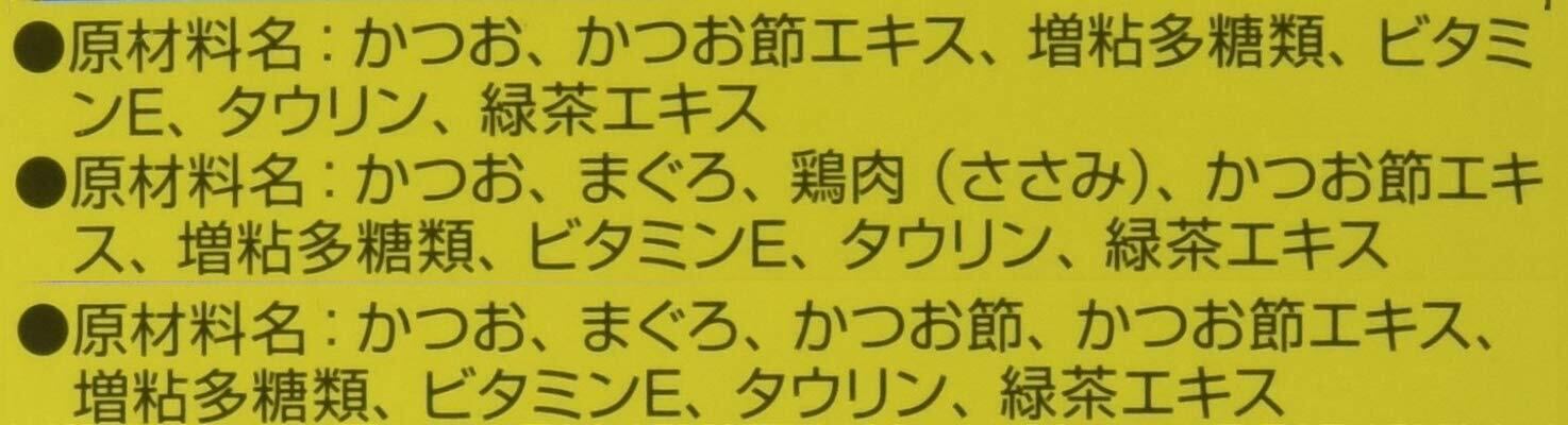 かつお:かつお、かつお節エキス、増粘多糖類、ビタミンE、タウリン、緑茶エキス ささみ・まぐろ・かつお:かつお、まぐろ、鶏肉(ささみ)、かつお節エキス、増粘多糖類、ビタミンE、タウリン、緑茶エキス まぐろ・かつお節入り:かつお、まぐろ、かつお節、かつお節エキス、増粘多糖類、ビタミンE、タウリン、緑茶エキス
