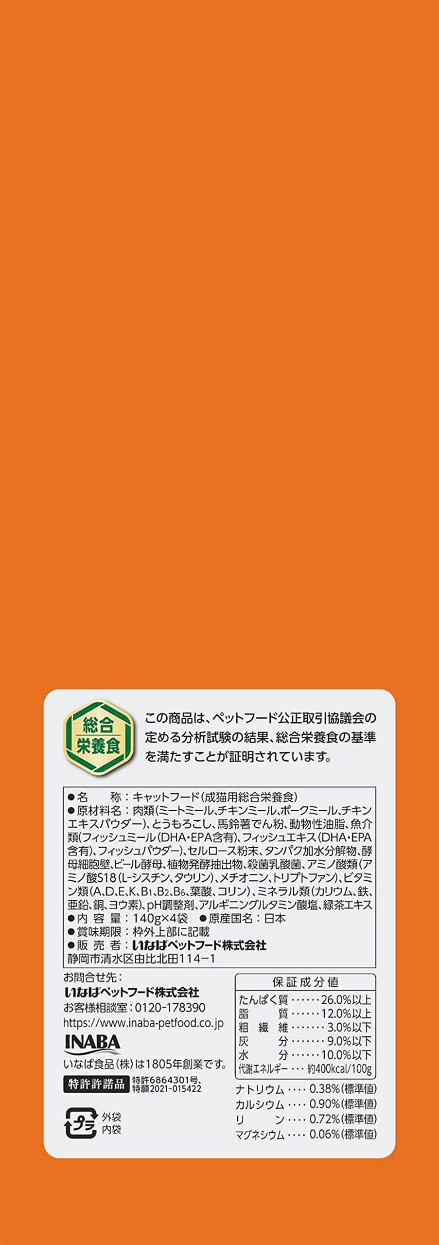 アミノ酸S18を配合、リン・ナトリウムを調整することにより、腎臓の健康維持に配慮しました。ミネラル成分の調整により尿石の形成に、食物繊維(セルロース)を配合することにより毛玉の形成にも配慮しています。140g×4袋の個包装で、いつでも新鮮にお与えいただけます。※本品は腎臓病を治療するものではありません。