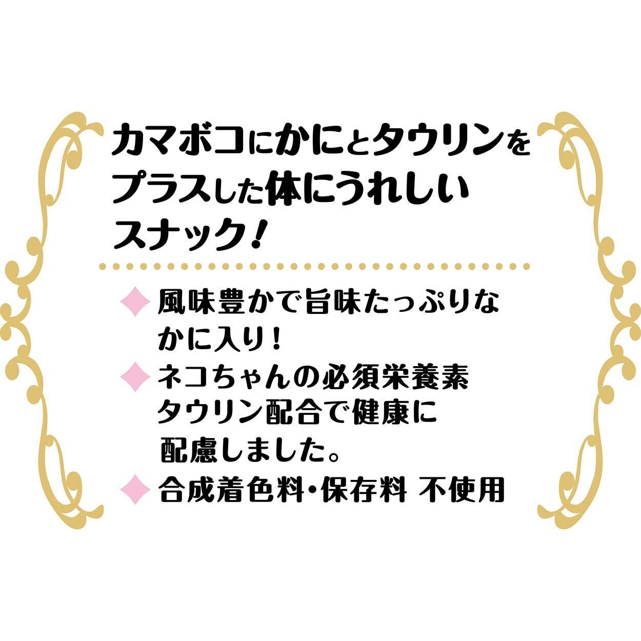 風味豊かで旨味たっぷりなかに入り! ネコちゃんの必須栄養素タウリン配合で健康に配慮しました。合成着色料・保存料不使用。