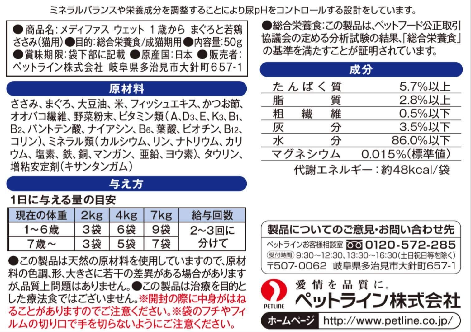 メディファス ウェット キャットフード 1歳から まぐろと若鶏ささみ 【総合栄養食/下部尿路/pHコントロール/国産】 50gx12 (まとめ買い)