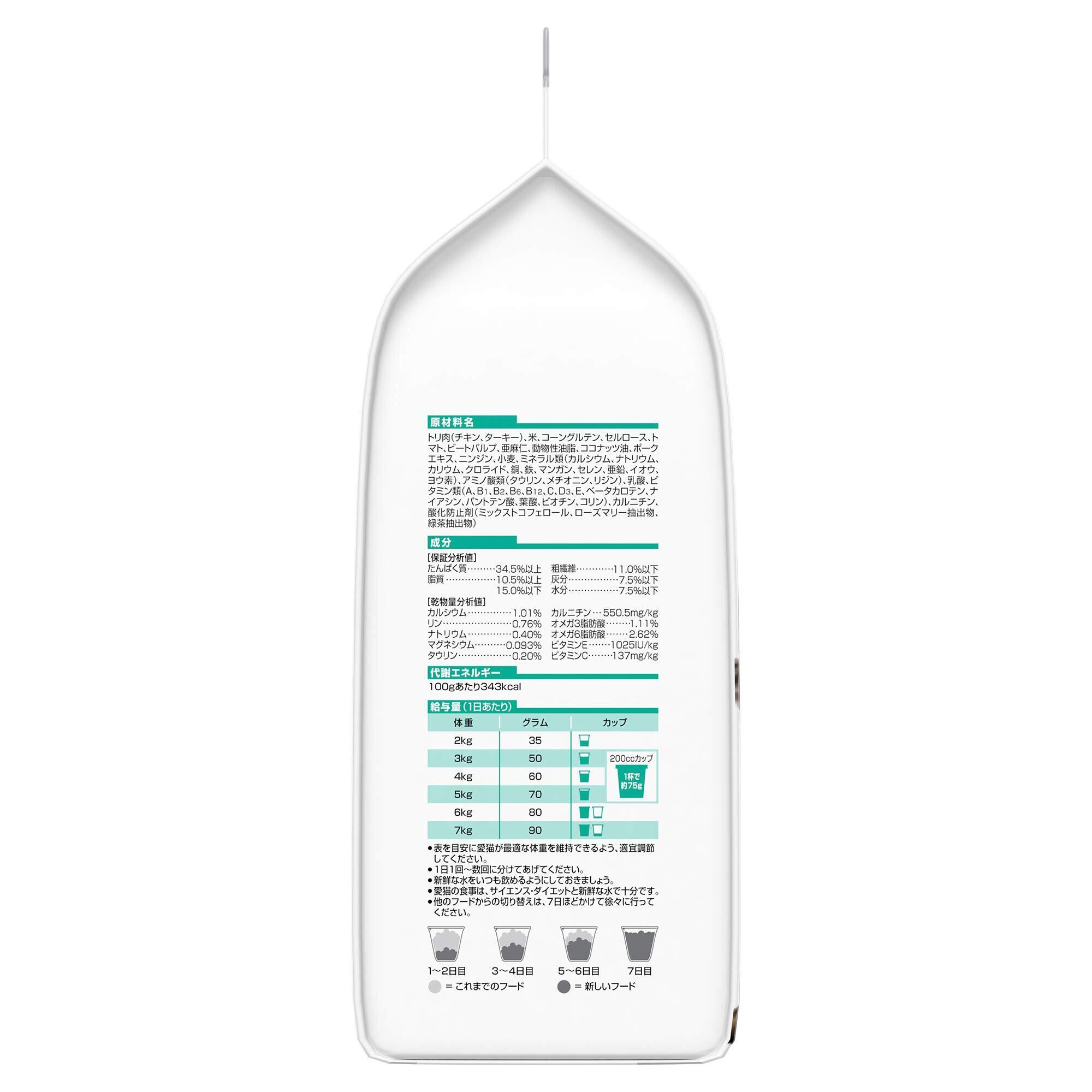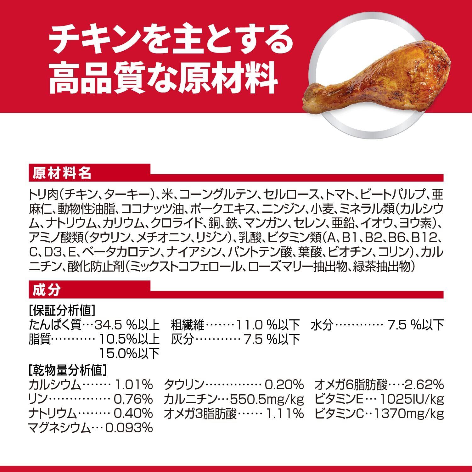 亜麻仁、ココナッツ油など、健康な代謝のための高品質な食材の組み合わせ。ヒルズ独自の低カロリーレシピ(当社「アダルト チキン 成猫用」ドライ製品と比較してカロリー約17%オフ)で健康的な減量とおいしく無理のない体重管理を実現します。ビタミンCとEを含む、科学的に証明された抗酸化成分によって本来の免疫力を維持。自然派成分で製品の酸化を防止し、着色料や合成香料は含まれていません。