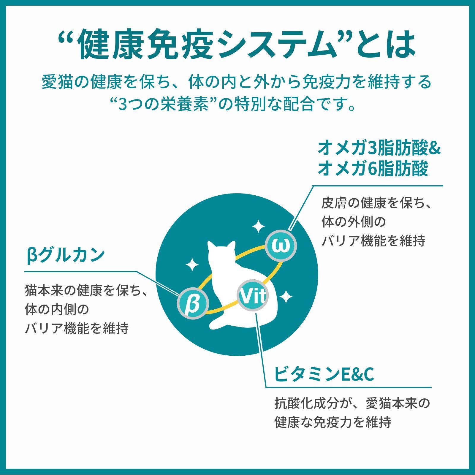 お腹と皮膚が敏感な猫のケアしたいポイントに基づいて開発。 皮膚の健康維持や腸内環境の健康ケアをサポートする栄養素を配合。3つの栄養素の特別な配合「健康免疫システム」で健康を保ち免疫力を維持。