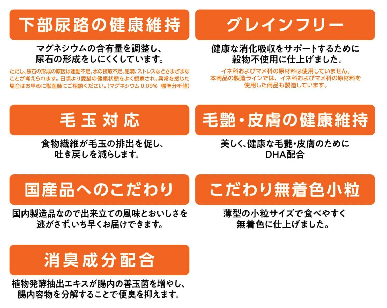 初めて与える場合は、今までの食事に少量まぜ、徐々に量を増やしながらお与えください。●ご注意:必ず新鮮なお水を充分用意してお与えください。この商品は猫の栄養バランスを満たしたフードです。猫以外のペットや他の動物には与えないでください。1粒1粒にかけられた味付けエキスのコーティングに多少のムラができることがありますが、品質には問題ありません。原材料の産地や製造時期などにより粒の色やサイズなどの見た目、においにばらつきが生じることがありますが、品質には問題ありません。