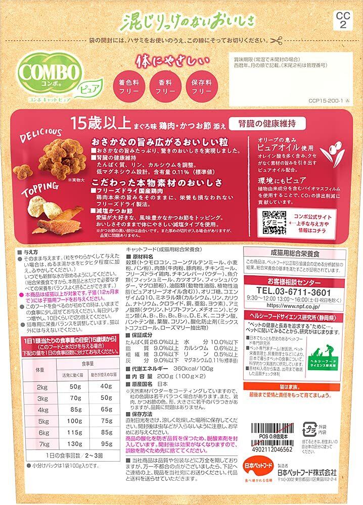 コンボピュア キャットフード ピュア キャット 15歳以上用 【無添加素材使用】 【国産】 【小分包装】 まぐろ味・鶏肉・かつお節添え 200g