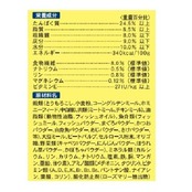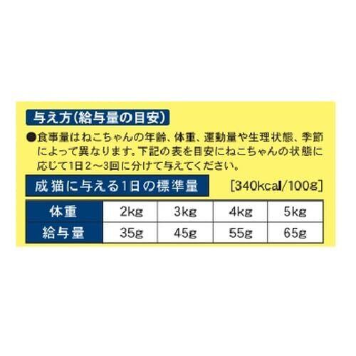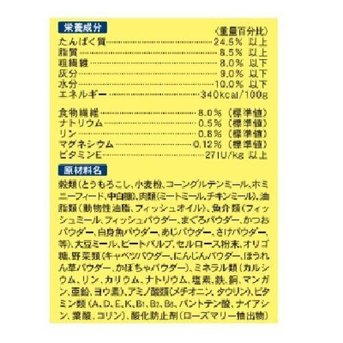 穀類(とうもろこし、小麦粉、コーングルテンミール、ホミニーフィード、中白糠)、肉類(ミートミール、チキンミール)、油脂類(動物性油脂、フィッシュオイル)、魚介類(フィッシュミール、フィッシュパウダー、まぐろパウダー、かつおパウダー、白身魚パウダー、あじパウダー、さけパウダー、等)、大豆ミール、ビートパルプ、セルロース粉末、オリゴ糖、野菜類(キャベツパウダー、にんじんパウダー、ほうれん草パウダー、かぼちゃパウダー)、ミネラル類(カルシウム、リン、カリウム、ナトリウム、塩素、鉄、銅、マンガン、亜鉛、ヨウ素)、アミノ酸類(メチオニン、タウリン)、ビタミン類(A、D、E、K、B1、B2、B6、パントテン酸、ナイアシン、葉酸、コリン)、酸化防止剤(ローズマリー抽出物)