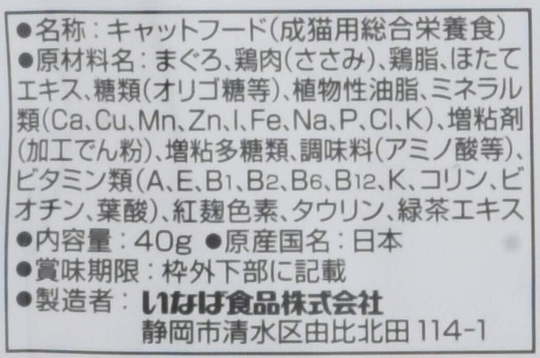 まぐろ、鶏肉(ささみ)、鶏脂、ほたてエキス、糖類(オリゴ糖等)、植物性油脂、ミネラル類(Ca、Cu、Mn、Zn、I、Fe、Na、P、Cl、K)、増粘剤(加工でん粉)、増粘多糖類、調味料(アミノ酸等)、ビタミン類(A、E、B1、B2、B6、B12、K、コリン、ビオチン、葉酸)、紅麹色素、タウリン、緑茶エキス
