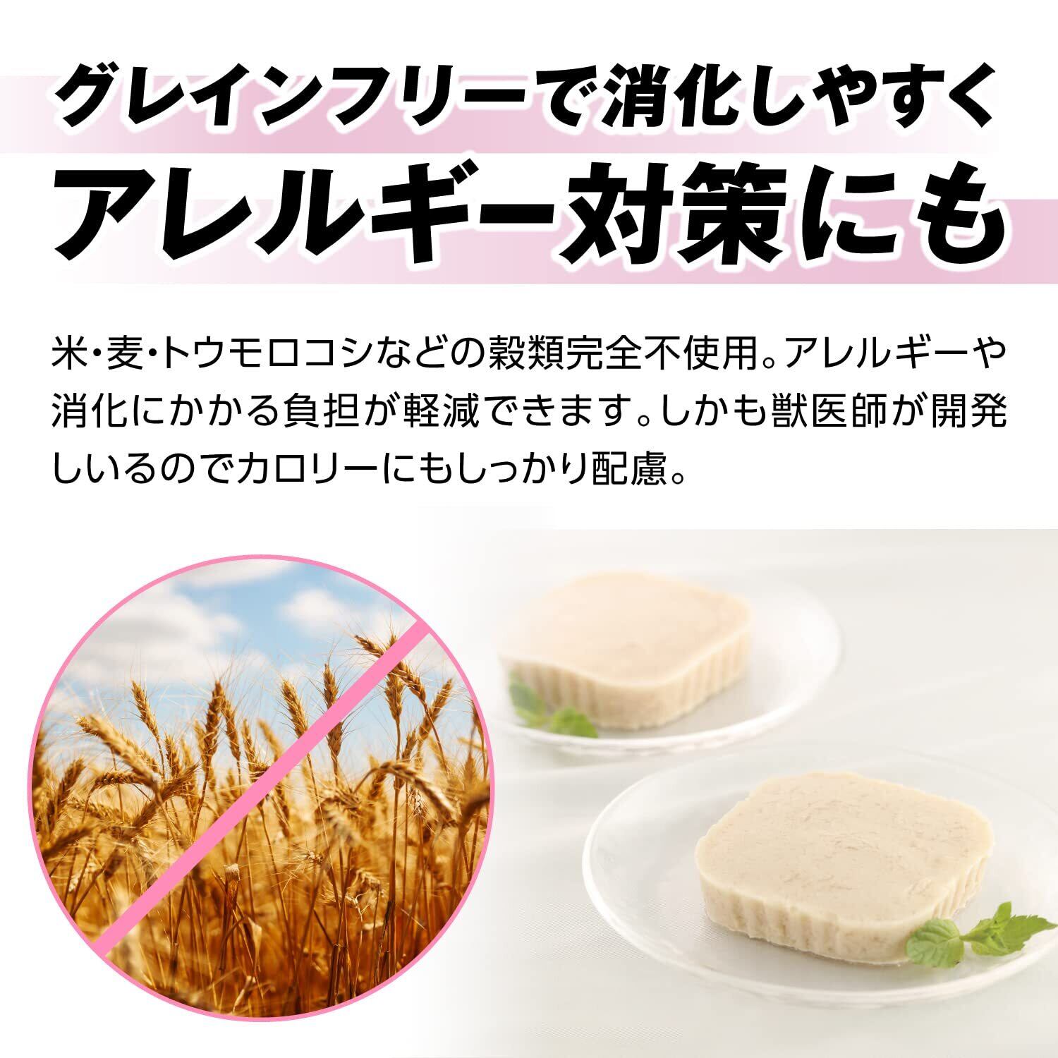 【原材料】肉類(鶏ササミ、鶏肉、カンガルー)、マグロ、サーモン、サイリウムハスク、カキ抽出物(タウリン含有)、植物性油脂、エゴマ油、増粘多糖類、ミネラル類(カリウム)、ビタミン類、メチオニン、ポリグルタミン酸、ラクトフェリン濃縮物