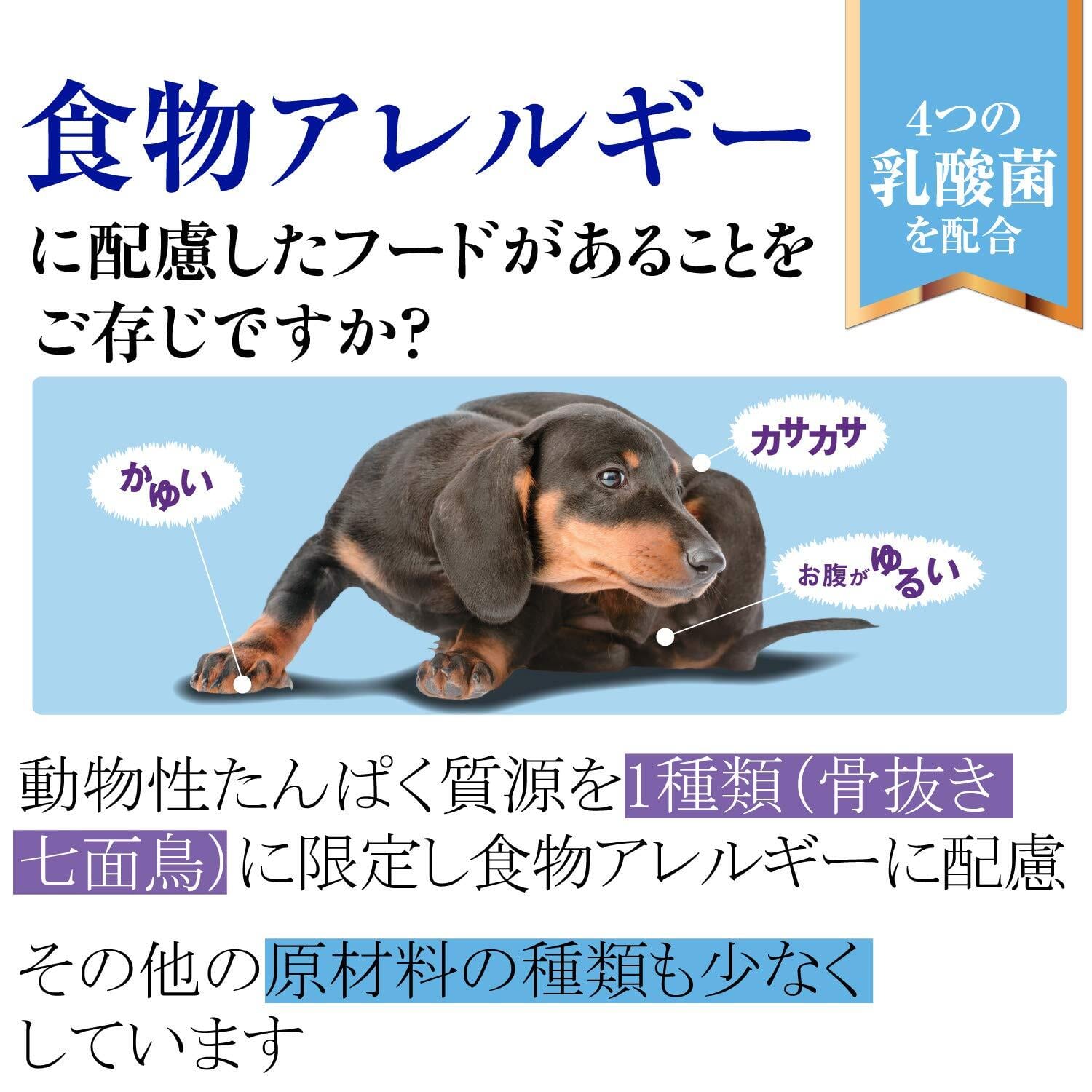 骨抜き七面鳥、七面鳥ミール、じゃがいも、えんどう、乾燥粗挽きじゃがいも、トマトポマス、粗挽き亜麻仁、キャノーラ油(ミックストコフェロールで酸化防止)、七面鳥エキス、チコリ根抽出物、ラクトバチルス・プランタルム※、エンテロコッカス・フェシウム※、ラクトバチルス・カゼイ※、ラクトバチルス・アシドフィラス※、ミネラル類(リン酸一水素カルシウム、亜鉛タンパク化合物、 硫酸亜鉛、炭酸カルシウム、硫酸第一鉄、鉄タンパク化合物、 硫酸銅、銅タンパク化合物、マンガンタンパク化合物、硫酸マンガン、亜セレン酸ナトリウム、ヨウ素酸カルシウム)、ビタミン類(E、コリン、ナイアシン、ベータカロテン、A、B1、パントテン酸、B6、B2、D3、ビオチン、B12、葉酸、C)、アミノ酸類(タウリン)、酸化防止剤(ミックストコフェロール、ローズマリー抽出物、緑茶抽出物、 スペアミント抽出物) ※乳酸菌