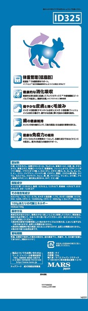 小麦、とうもろこし、肉類(チキンミール、ラムミール、家禽ミール)、大麦、米、チキンオイル、家禽エキス、乾燥ビートパルプ、乾燥酵母、フィッシュオイル、STPP (トリポリリン酸塩)、フラクトオリゴ糖、L-カルニチン、ビタミン類(A、B1、B2、B6、B12、C、D3、E、K3、コリン、ナイアシン、パントテン酸、ビオチン、葉酸)、ミネラル類(亜鉛、カリウム、カルシウム、クロライド、セレン、鉄、銅、ナトリウム、マンガン、ヨウ素)、アミノ酸類(メチオニン)、酸化防止剤(BHA、BHT、クエン酸)
