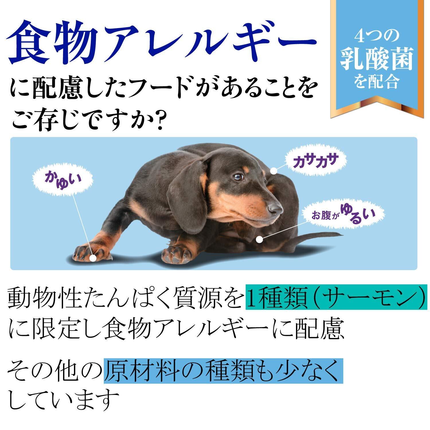 サーモン、サーモンミール、じゃがいも、えんどう、乾燥粗挽きじゃがいも、トマトポマス、キャノーラ油(ミックストコフェロールで酸化防止)、粗挽き亜麻仁、サーモンエキス、チコリ根抽出物、ラクトバチルス・プランタルム※、エンテロコッカス・フェシウム※、ラクトバチルス・カゼイ※、ラクトバチルス・アシドフィラス※、コンドロイチン硫酸、グルコサミン、ミネラル類(リン酸一水素カルシウム、亜鉛タンパク化合物、硫酸亜鉛、炭酸カルシウム、硫酸第一鉄、鉄タンパク化合物、硫酸銅、銅タンパク化合物、マンガンタンパク化合物、硫酸マンガン、亜セレン酸ナトリウム、ヨウ素酸カルシウム) 、ビタミン類(E、ナイアシン、ベータカロテン、A、B1、パントテン酸、B6、B2、D3、 ビオチン、B12、葉酸、C)、アミノ酸類(タウリン)、酸化防止剤(ミックストコフェロール、ローズマリー抽出物、緑茶抽出物、 スペアミント抽出物) ※乳酸菌