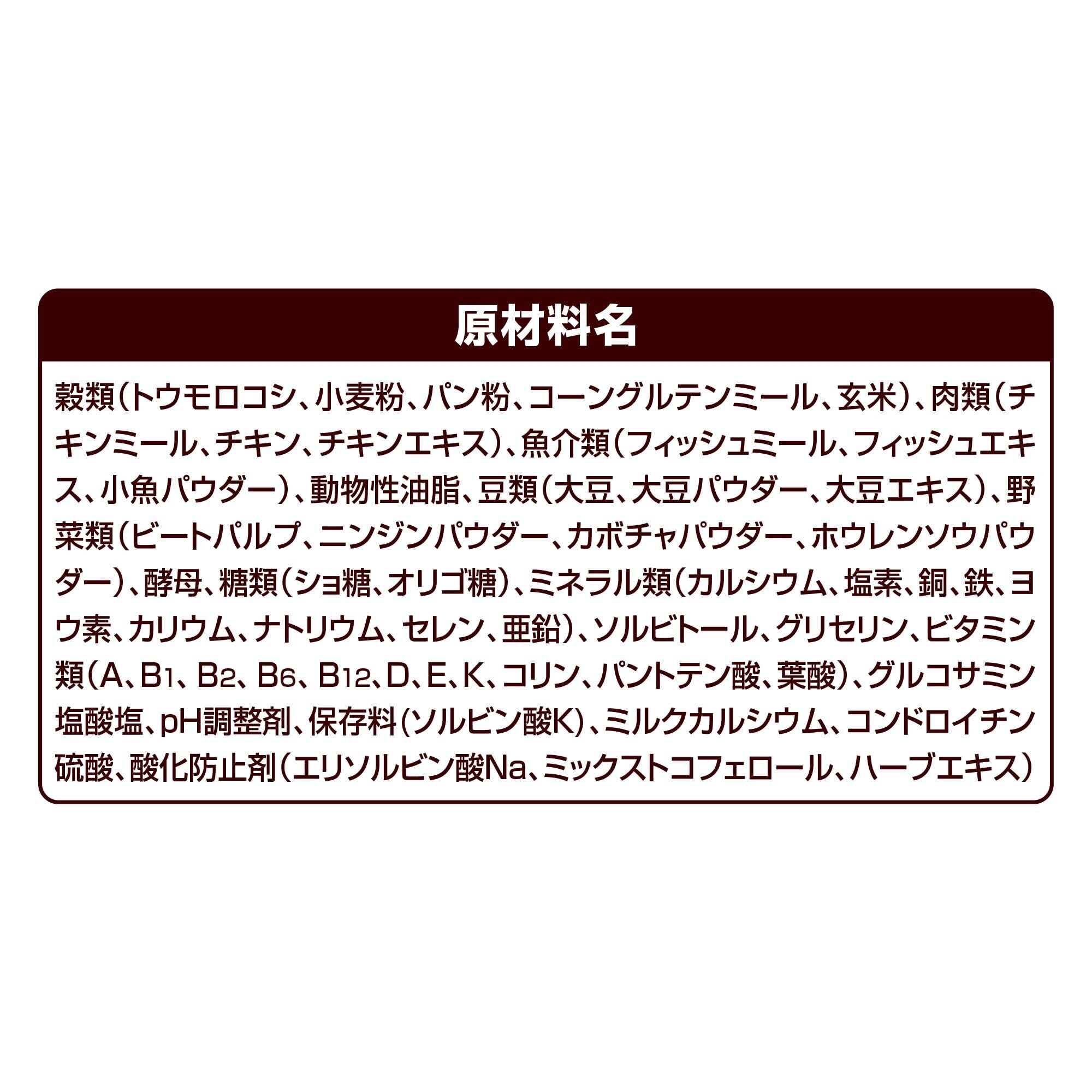 穀類(トウモロコシ、小麦粉、パン粉、コーングルテンミール、玄米)、肉類(チキンミール、チキン、チキンエキス)、魚介類(フィッシュミール、フィッシュエキス、小魚パウダー)、動物性油脂、豆類(大豆、大豆パウダー、大豆エキス)、野菜類(ビートパルプ、ニンジンパウダー、カボチャパウダー、ホウレンソウパウダー)、酵母、糖類(ショ糖、オリゴ糖)、ミネラル類(カルシウム、塩素、銅、鉄、ヨウ素、カリウム、ナトリウム、亜鉛)、ソルビトール、グリセリン、ビタミン類(A、B1、B2、B6、B12、D、E、K、コリン、パントテン酸)、グルコサミン塩酸塩、pH調整剤、保存料(ソルビン酸K)、ミルクカルシウム、酸化防止剤(エリソルビン酸Na、ミックストコフェロール、ハーブエキス)、コンドロイチン硫酸