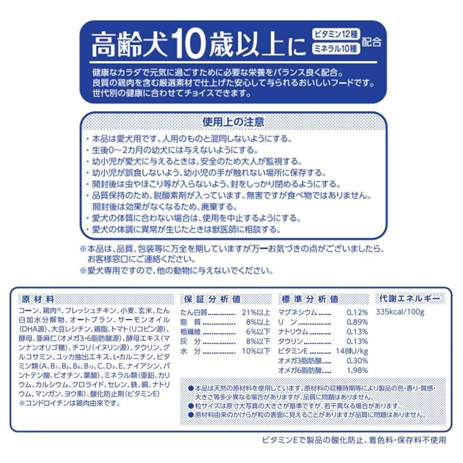 ●ハイシニア犬の健康を考えた栄養バランスを考えた食事です●主原料は栄養バランスに優れ、おいしくてヘルシーな厳選された鶏肉を使用●食物繊維配合でお腹が緩くなることを防ぐ(※1)●健康を保ち本来の免疫力を維持します(※2)●健康な関節の維持にグルコサミン、コンドロイチンを配合●噛む力の弱くなったハイシニア犬に配慮した食べやすいドーナツ型粒 ※1食物繊維(玄米、オートブラン、チコリ)を配合し軟便を防ぎます ※2抗酸化成分のリコピン、ビタミンC、E配合
