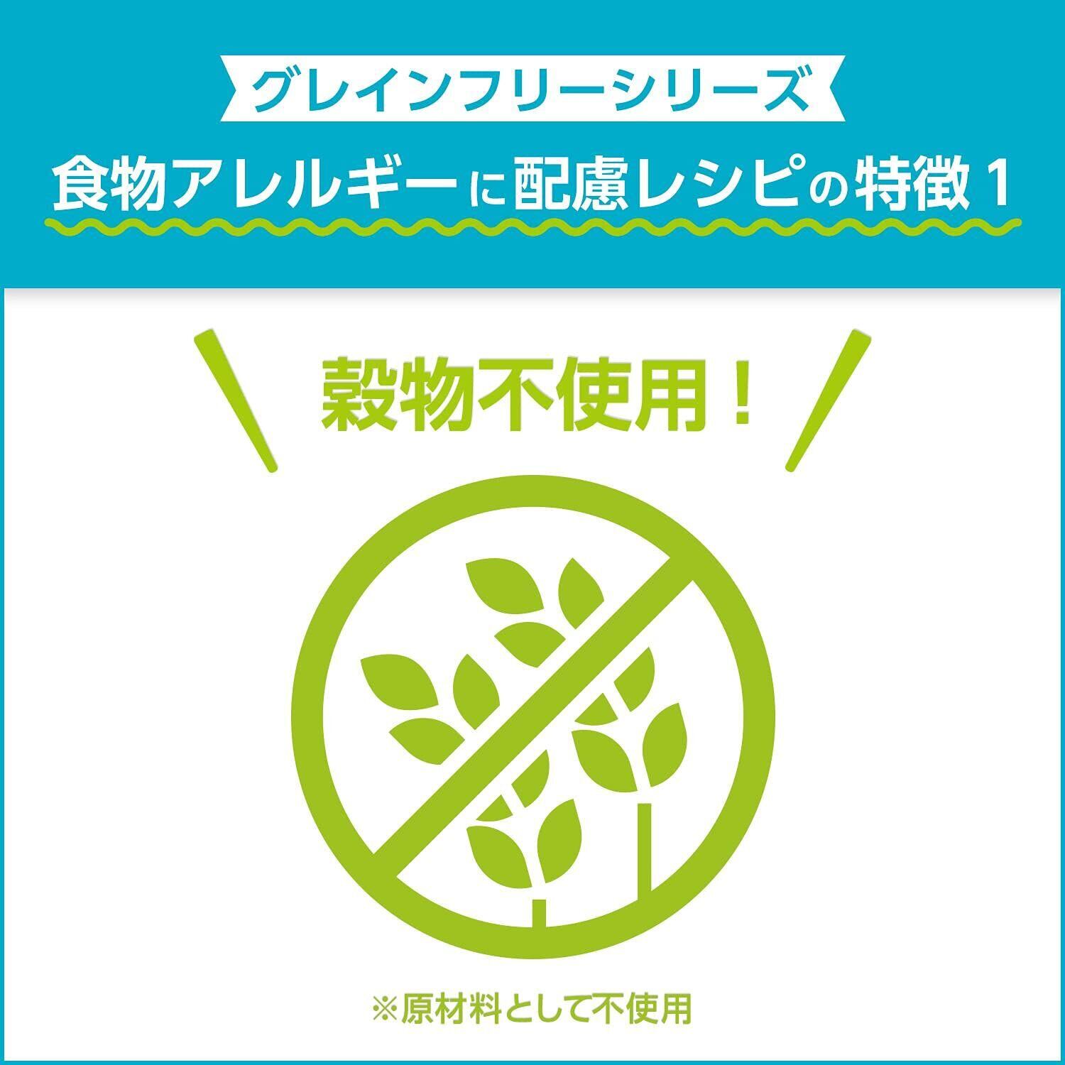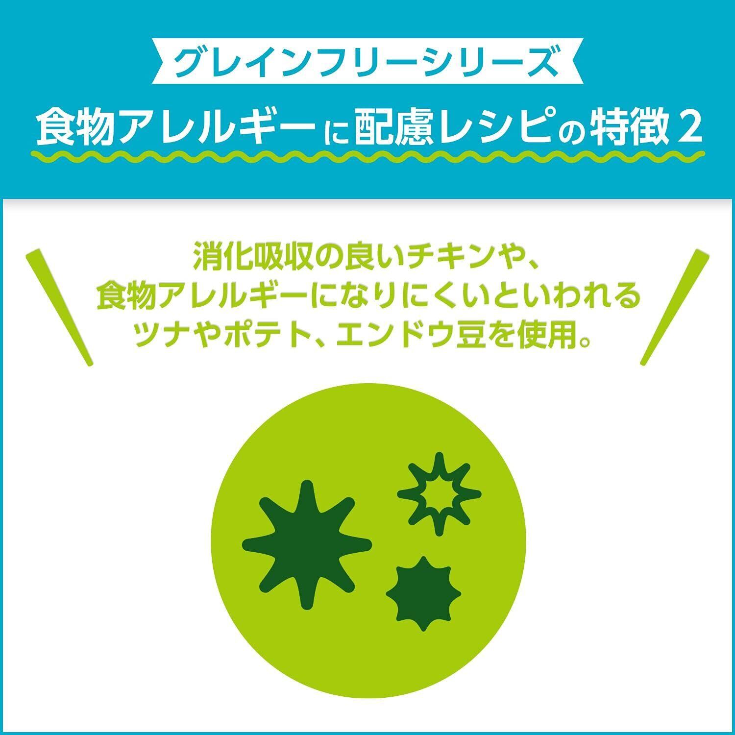 チキンミール(アルギニン源)、ポテト、エンドウ豆、家禽類、キャノーラミール、鶏脂(リノール酸源)、チキンエキス、シュガービートパルプ、ツナミール(DHA、EPA源)、タピオカスターチ、STPP(トリポリリン酸塩)、ビタミン類(A、B1、B2、B6、B12、C、D3、E、コリン、ナイアシン、パントテン酸、葉酸)、ミネラル類(亜鉛、カリウム、クロライド、セレン、鉄、銅、ナトリウム、ヨウ素)、酸化防止剤(BHA、BHT、クエン酸、ミックストコフェロール、ローズマリー抽出物)