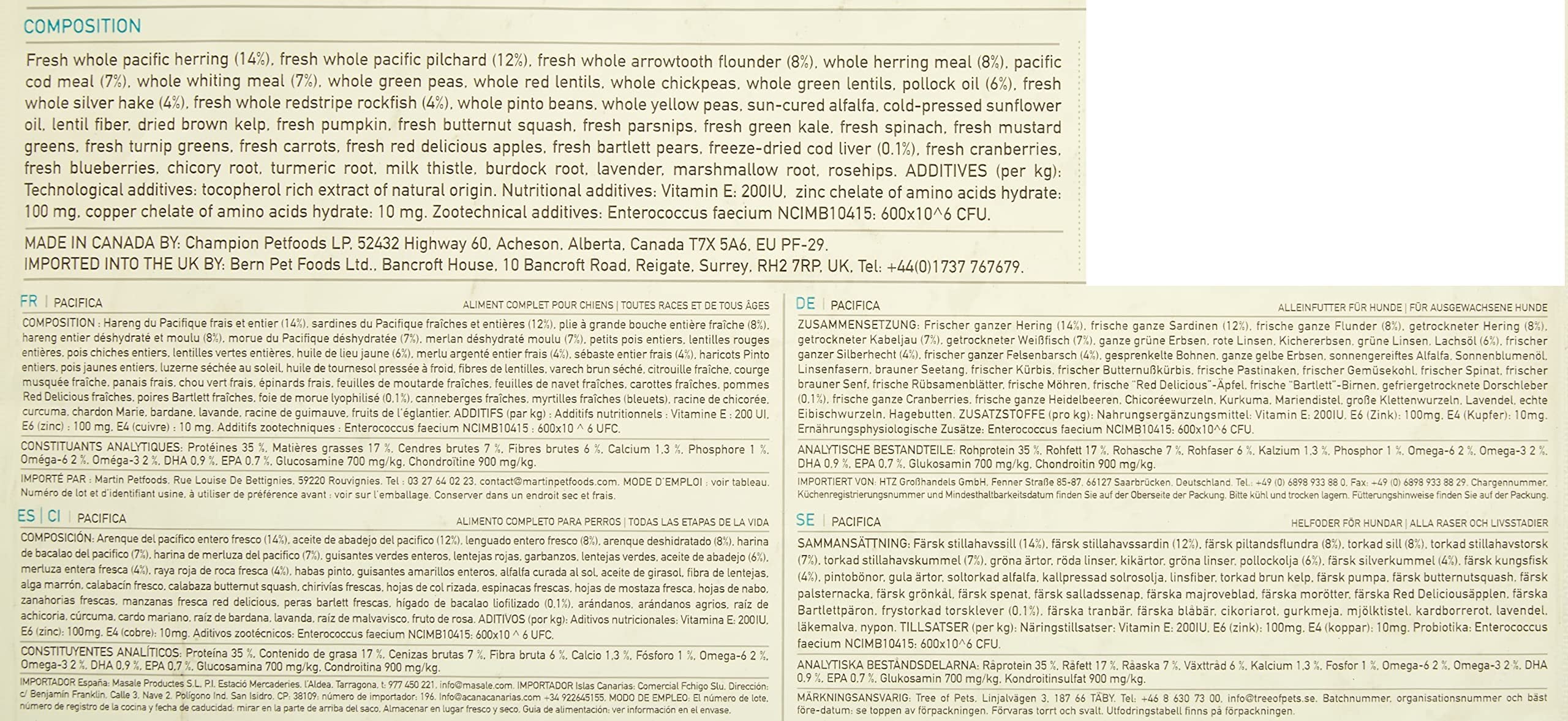 新鮮丸ごと太平洋ニシン (14%)、新鮮丸ごと太平洋イワシ(12%)、新鮮丸ごとアブラカレイ(8%)、丸ごとニシンミール(8%)、太平洋タラミール(7%)、丸ごとシロガネダラミール(7%)、丸ごとグリンピース、丸ごと赤レンズ豆、丸ごとヒヨコ豆、丸ごと緑レンズ豆、タラ油(6%)、新鮮丸ごとシルバーヘイク(4%)、新鮮丸ごとレッドストライプメバル(4%)、丸ごとピント豆、丸ごとイエローピース、日干しアルファルファ、 コールドプレスヒマワリ油、レンズ豆繊維、 乾燥ブラウンケルプ、新鮮カボチャ、新鮮バターナッツスクワッシュ、新鮮パースニップ、新鮮グリーンケ―ル、新鮮ホウレン草、新鮮カラシ菜、新鮮カブラ菜、新鮮ニンジン、新鮮レッドデリシャスリンゴ、新鮮バートレット梨、フリーズドライタラレバー(0.1%)、新鮮クランベリー、新鮮ブルーベリー、チコリー根、ターメリックルート、オオアザミ、ごぼう、ラベンダー、マシュマロルート、ローズヒップ。添加栄養素(1kg中):天然濃厚トコフェロール:ビタミンE:200IU,アミノ酸水和物亜鉛キレート:100mg,アミノ酸水和物銅キレート:10mg,添加腸球菌:エンテロコッカス・フェシウム菌NCIMB10415:600x10^6CFUビタミンEで天然保存