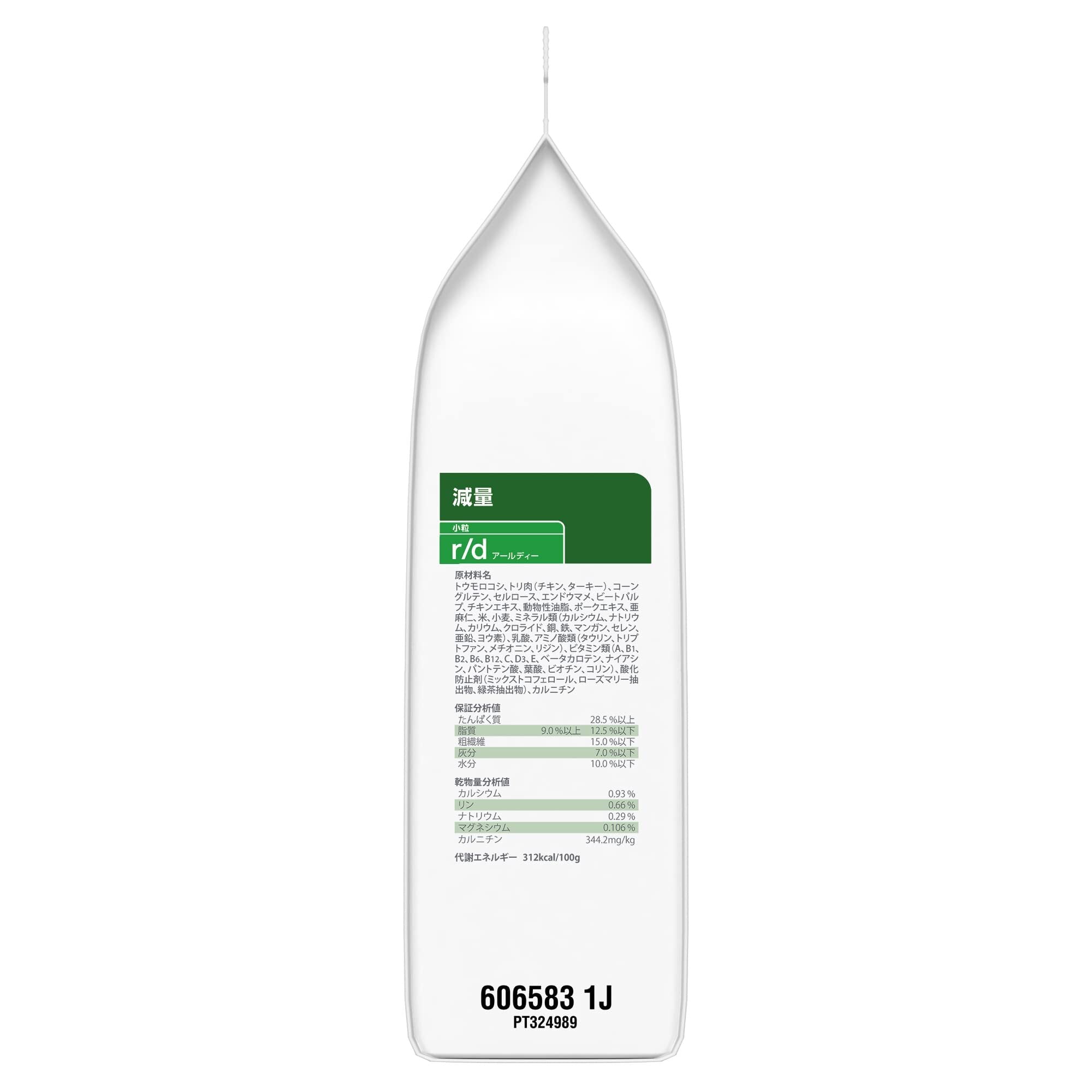 今やペットの約半数が肥満であると言われています。ほんの少し体重が増えるだけでも、ペットと家族が遊ぶ時間が減少してしまったり、関節への負担増などによって、生活の質(クオリティ・オブ・ライフ)が下がってしまうと言われています。そんなペットのために、ヒルズの栄養学者と獣医師が開発したのが、体重減量に特化した特別療法食 プリスクリプション・ダイエット 犬用 r/d アールディー 小粒です。この製品は、低脂肪と低カロリーで、8週間で健康的な減量に役立つことが科学的に証明されたフードです。