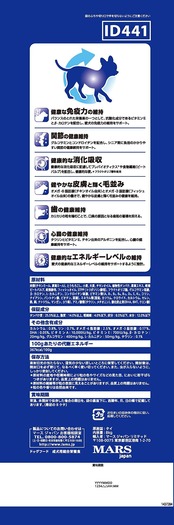 肉類(チキンミール、家禽ミール)、とうもろこし、小麦、大麦、チキンオイル、植物性タンパク、家禽エキス、乾燥ビートパルプ、乾燥酵母、フィッシュオイル、STPP (トリポリリン酸塩)、フラクトオリゴ糖、グルコサミン塩酸、β-カロテン、L-カルニチン、コンドロイチン硫酸、ビタミン類(A、B1、B2、B6、B12、D3、E、K3、コリン、ナイアシン、パントテン酸、ビオチン、葉酸)、ミネラル類(亜鉛、カリウム、クロライド、カルシウム、セレン、鉄、銅、ナトリウム、マンガン、ヨウ素)、アミノ酸類(タウリン、メチオニン)、酸化防止剤(BHA、BHT、クエン酸)