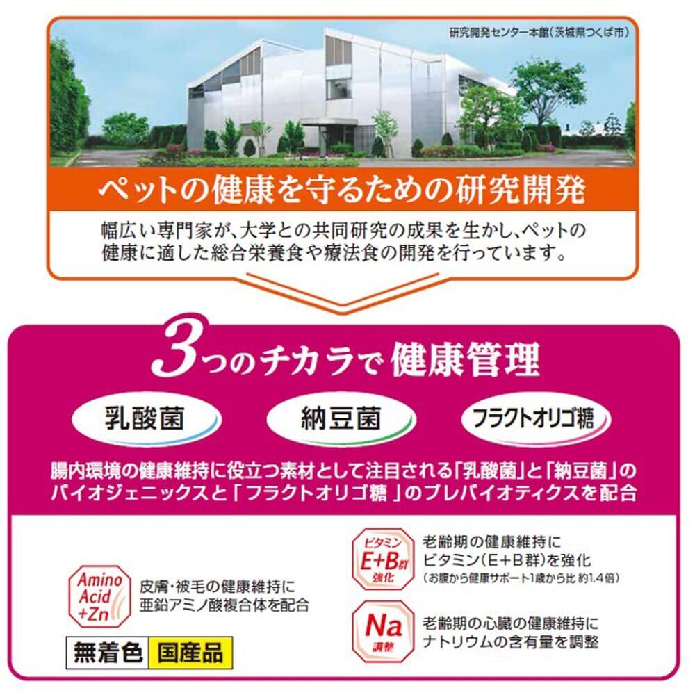 原材料:穀類(とうもろこし、米、コーングルテンミール)、豆類(脱脂大豆、おから)、肉類(ミートミール、チキンミール、チキンレバーパウダー)、油脂類(動物性油脂)、魚介類(フィッシュミール)、糖類(フラクトオリゴ糖)、セルロース、セレン酵母、乳酸菌エキス、納豆菌エキス、酵母菌エキス、ビタミン類(A、D3、E、K3、B1、B2、パントテン酸、ナイアシン、B6、葉酸、ビオチン、B12、C、コリン)、ミネラル類(カルシウム、リン、ナトリウム、塩素、鉄、コバルト、銅、マンガン、亜鉛アミノ酸複合体、亜鉛、ヨウ素)、アミノ酸類(メチオニン)、酸化防止剤(ローズマリー抽出物、ミックストコフェロール)