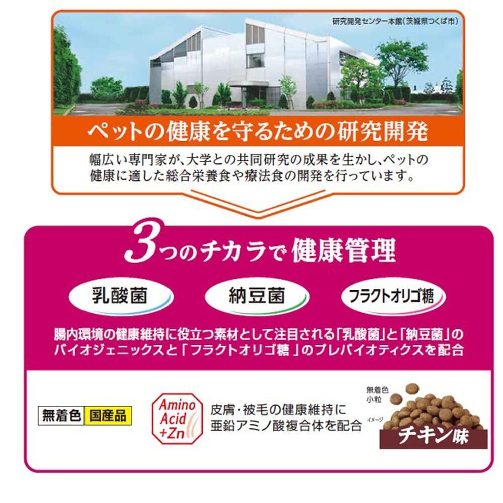 バイオジェニックスとして「乳酸菌」「納豆菌」、プレバイオティクスとして「フラクトオリゴ糖」を配合。「乳酸菌」「納豆菌」「フラクトオリゴ糖」の3つのチカラで愛犬の腸内フローラを整え、毎日の健康維持をサポートします。