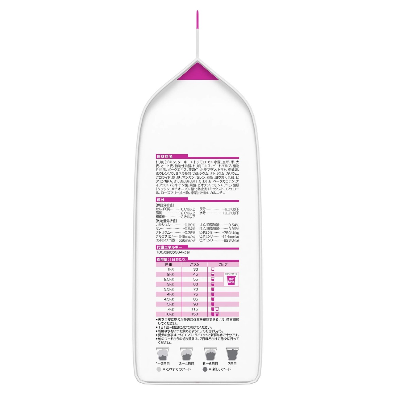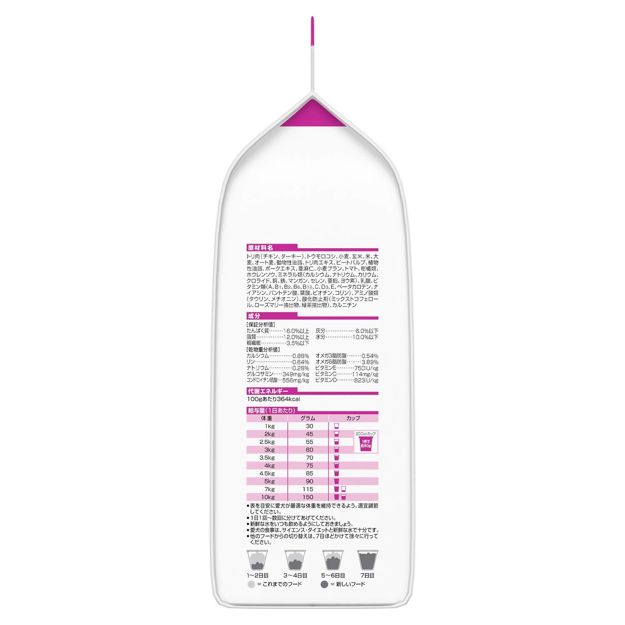 愛犬がライフステージに気をつけながら毎日健康で元気に過ごすための、免疫力、心臓、腎臓の健康をサポートする、最適な栄養バランスのドッグフードです。7歳以上の高齢犬のトイプードル、チワワやミニチュアダックスフンドといった小型犬種に対応。ナトリウムとリンの量を適切に調整し、腎臓と心臓の健康を維持します。カルシウムやグルコサミン、コンドロイチン硫酸が、健康な骨や関節をサポートするとともに、ビタミンD&Cを配合することで、歯と歯ぐきの健康を維持。また、ビタミンEとオメガ3&6脂肪酸が、健康な皮膚と美しい被毛をサポートします。さらに、消化に良い高品質な自然素材を、小型犬が食べやすい小さな粒に凝縮しています。この製品は、ペットフード公正取引協議会の定める分析試験の結果、成犬用の総合栄養食であることが証明されています。