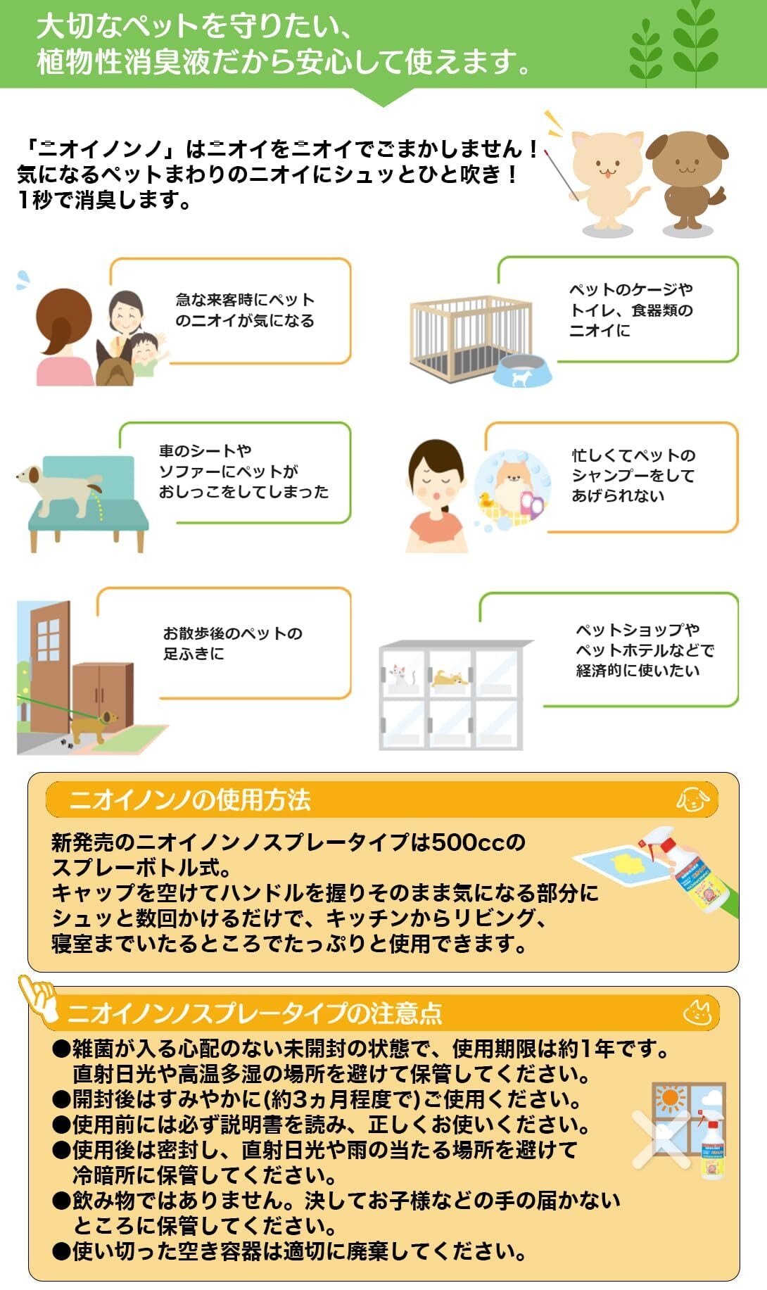 1、ニオイノンノスプレータイプは500ccのスプレーボトル式。キャップを空けてハンドルを握りそのまま気になる部分にシュッと数回かけるだけで、キッチンからリビング、寝室までいたるところでたっぷりと使用できます。 2、ニオイノンノは100%天然植物エキスで作られています。 3、無臭なのにさわやか。まるで森林浴のような香りが広がります。