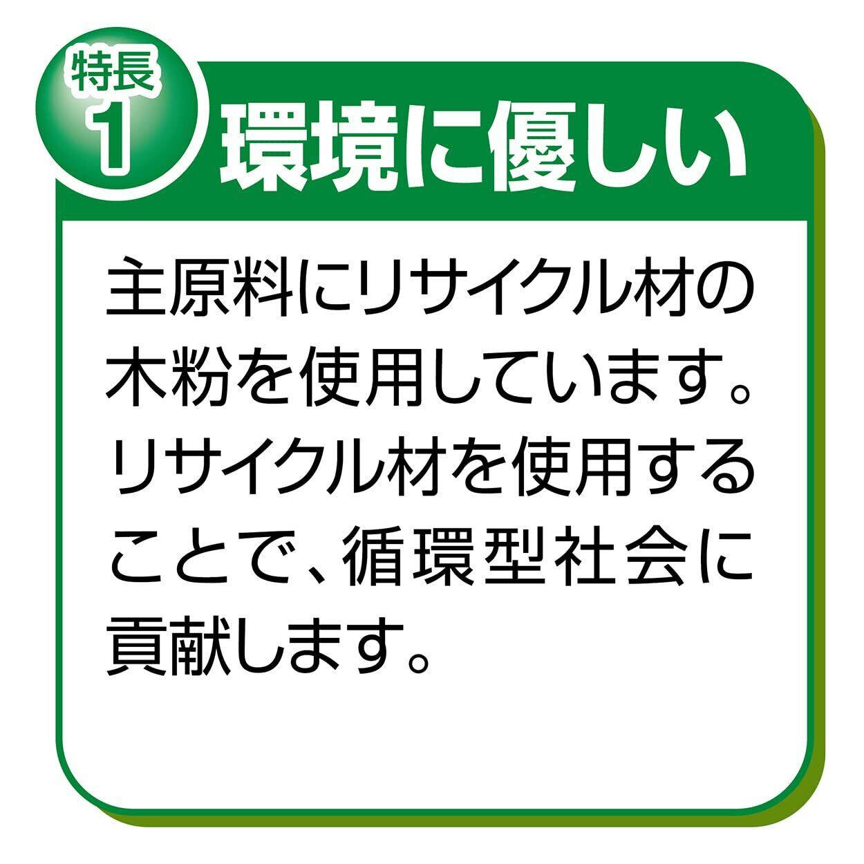 ●環境に優しい:主原料にリサイクル材の木粉を使用しています。リサイクル材を使用することで、循環型社会に貢献します。●小さく固まる:ガッチリ小さく固まるので、お掃除が簡単です。少ない量で固まるので経済的にお使いいただけます。※固まり具合は、愛猫の個体差によって異なります。●消臭・銀イオン:木の成分のフィトンチッドによる消臭効果。尿の悪臭成分アンモニア臭を消臭します。銀イオン水配合により人にもペットにも安全なので、安心してお使いいただけます。●燃やせる:木の粉が主原料ですので、可燃ゴミとして処理できます。