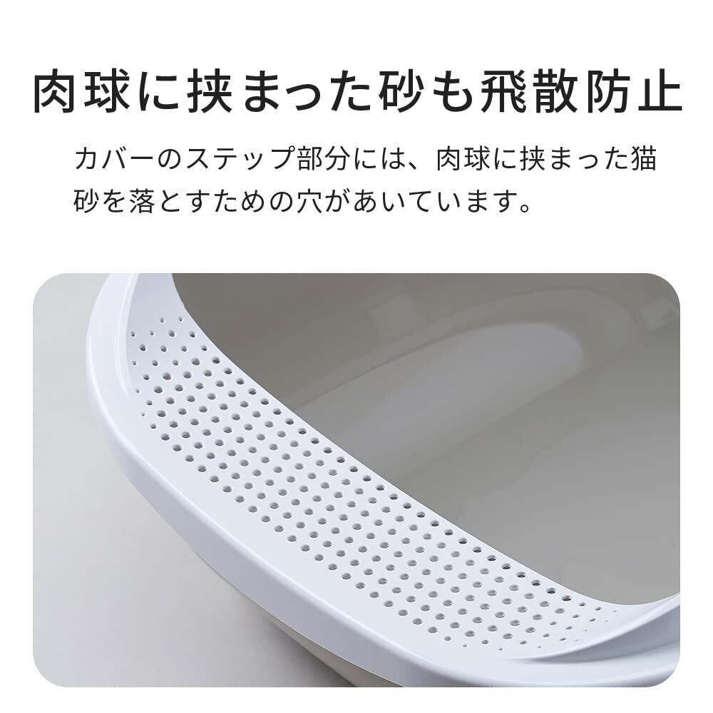 幅48×奥65cmと広いので、大きな体格のネコちゃんでもトイレの失敗も少なく使用できます。 砂かきに対応するように飛び散り防止のカバーが付いています。背面は高さもあるので、より砂の飛散を防止できます。 本体はポリプロピレン樹脂で出来ていますので、丸洗いが可能です。日頃のお手入れがしやすいのも嬉しいですね。 ※洗った後は、完全に乾かしてからご利用下さい。 飛び散り防止カバーは外せるので、お手入れも隅々まで出来て清潔に使えるのが嬉しいですね。