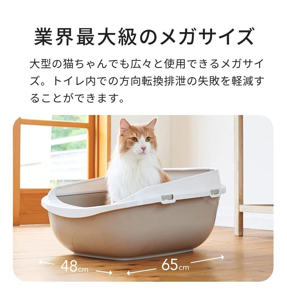 大容量28ℓ。幅48×奥65cmと広いので、大型の猫ちゃんでも広々と使用できるメガサイズ。 トイレ内での方向転換がしやすく、排泄の失敗も軽減することができます。大型猫トイレ【メガトレー】。ネコちゃんにゆったり落ち着いた時間を。 大型猫や多頭飼いのオーナーさんの大きなトイレが欲しい!というご要望に応えるべく、 大容量28リットルの、名前通り大きさメガ級のトイレが登場しました。