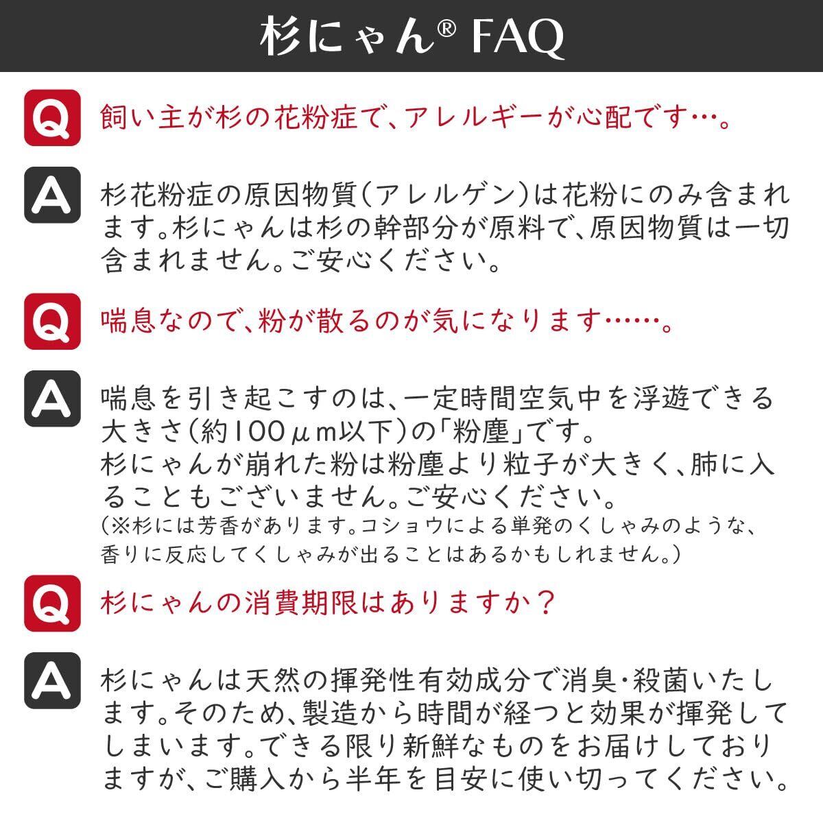 【1、完全無添加!誤食しても安心です】 防腐剤、防カビ剤、凝固剤、脱臭剤などを一切加えない完全無添加!「猫に有害な添加物や地球に優しくない物質」を使わず、杉にゃんはオーガニックを徹底的に追求しました。杉にゃんの猫砂に有害な成分は一切含まれません。口に入っても食物繊維として排出されるのでご安心ください。