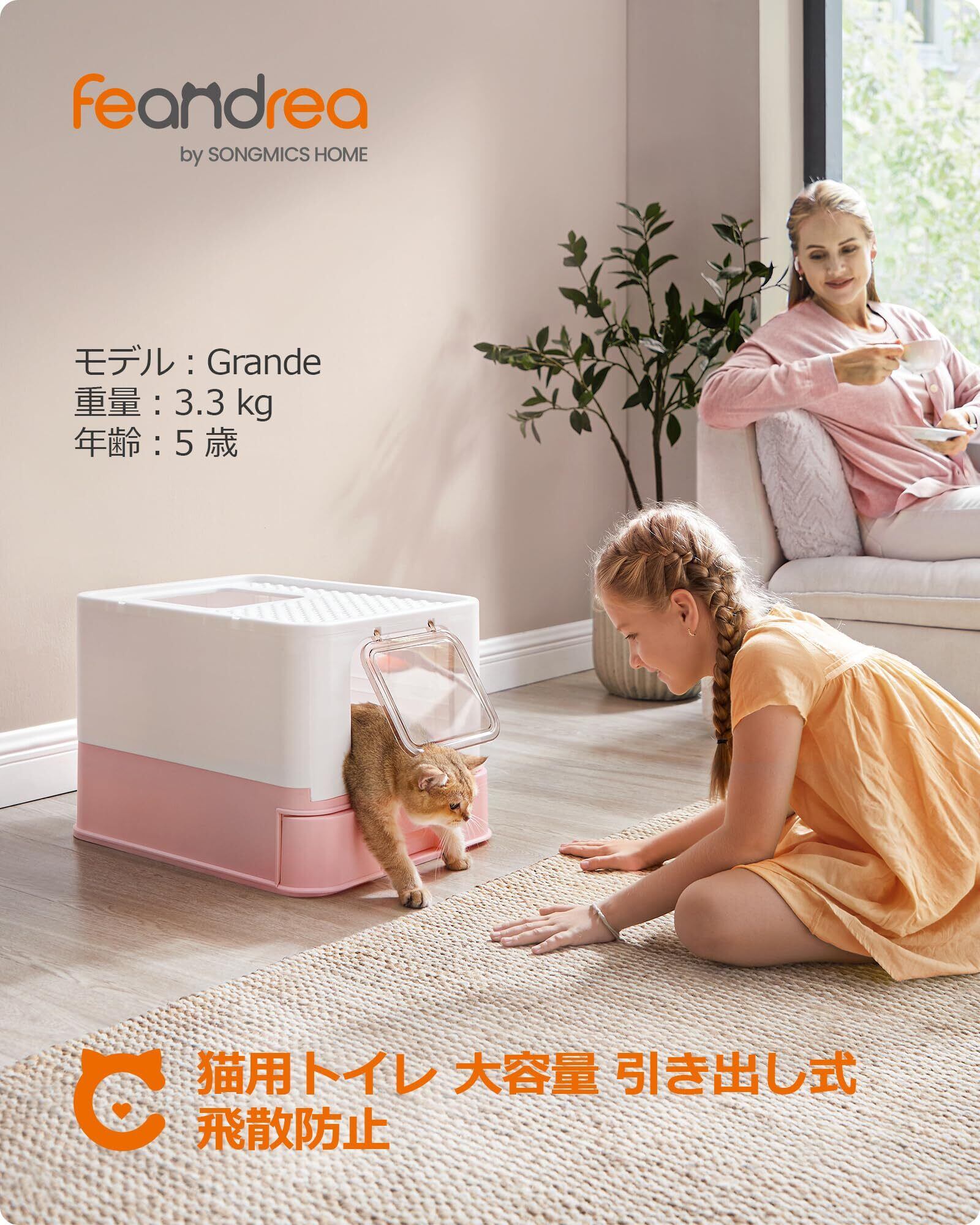 FEANDREA 猫トイレ 大型 スコップ付 折畳式 飛散防止 掃除簡単 漏れ防止 組み立て簡単 2WAY出入り方法 大容量 猫トイレ消臭 54.3×42.5×37.8cm PPT001P01