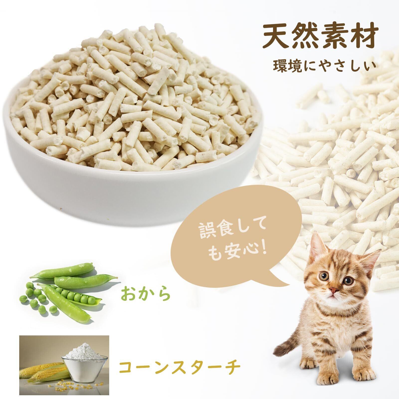 【天然素材】Gatitos猫砂は天然のおからとコーンスターチで作られていますので、猫が誤食しても安心です。